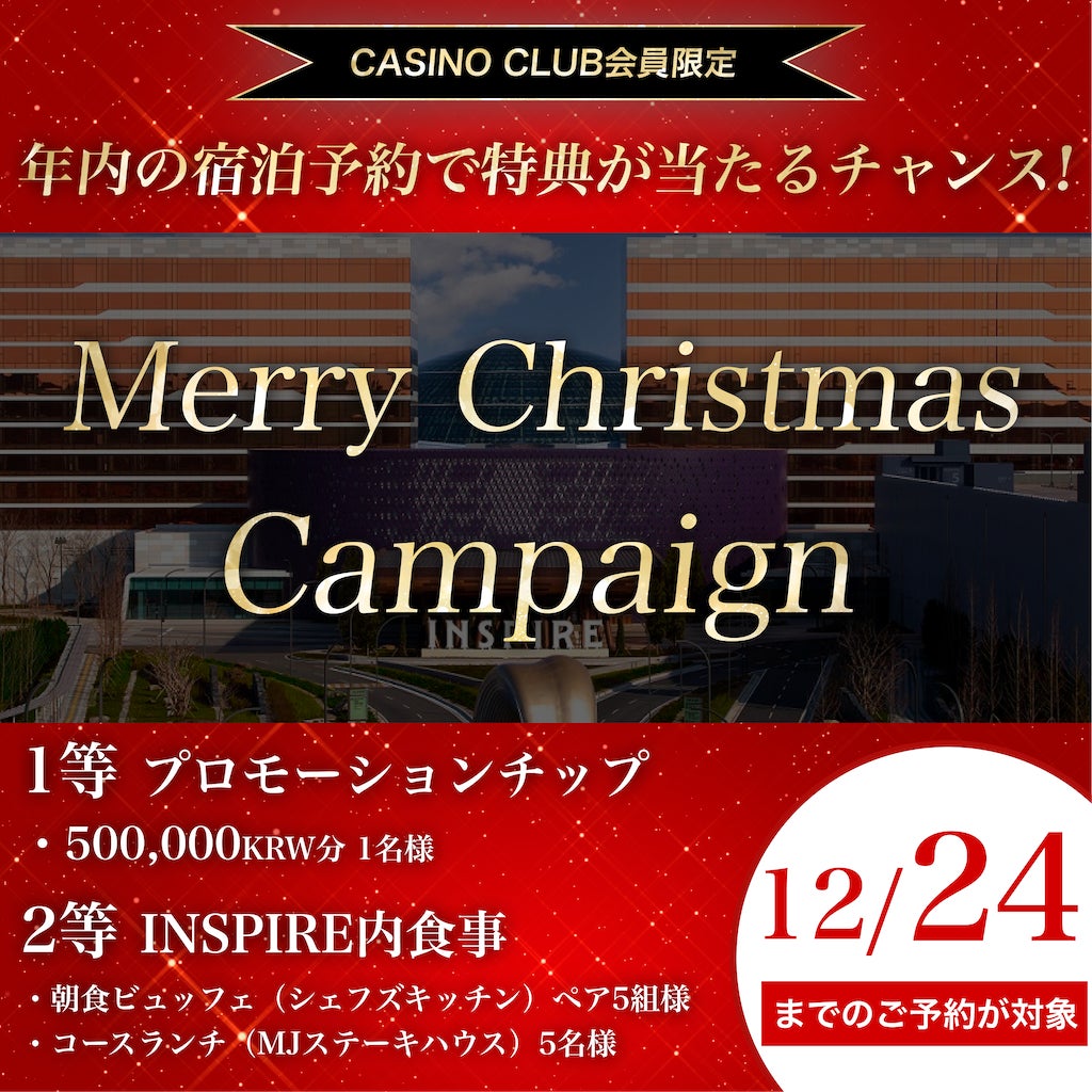 株式会社INSPIRE VIP CASINO CLUB(本社:東京都目黒区)は、2024年11月1日より「Merry Christmas Campaign」を開催いたします。本キャンペーンの開催期間中に、カジノクラブを通じてインスパイアホテルへの宿泊予約を完了いただいた方には、自動でエントリーをさせていただきます。