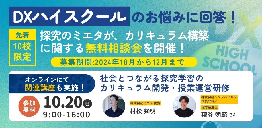 株式会社ミエタ(東京都港区、代表取締役:村松知明、以下ミエタ社)は、全国の学校DX加速化推進事業採択校(DXハイスクール)および来年度以降にDXハイスクールの交付申請を検討している学校向けに、カリキュラム構築などのお悩みに回答する無料相談会を、2024年10月から12月にかけて、先着10校限定で開催いたします。