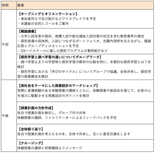また、同時に教職員向けの1日集中講座「社会とつながる探究学習のカリキュラム開発・授業運営研修」を、10月20日(日)に無償で開催し、概論講義にて、DXハイスクールに求められる探究のあり方についても講演いたします。