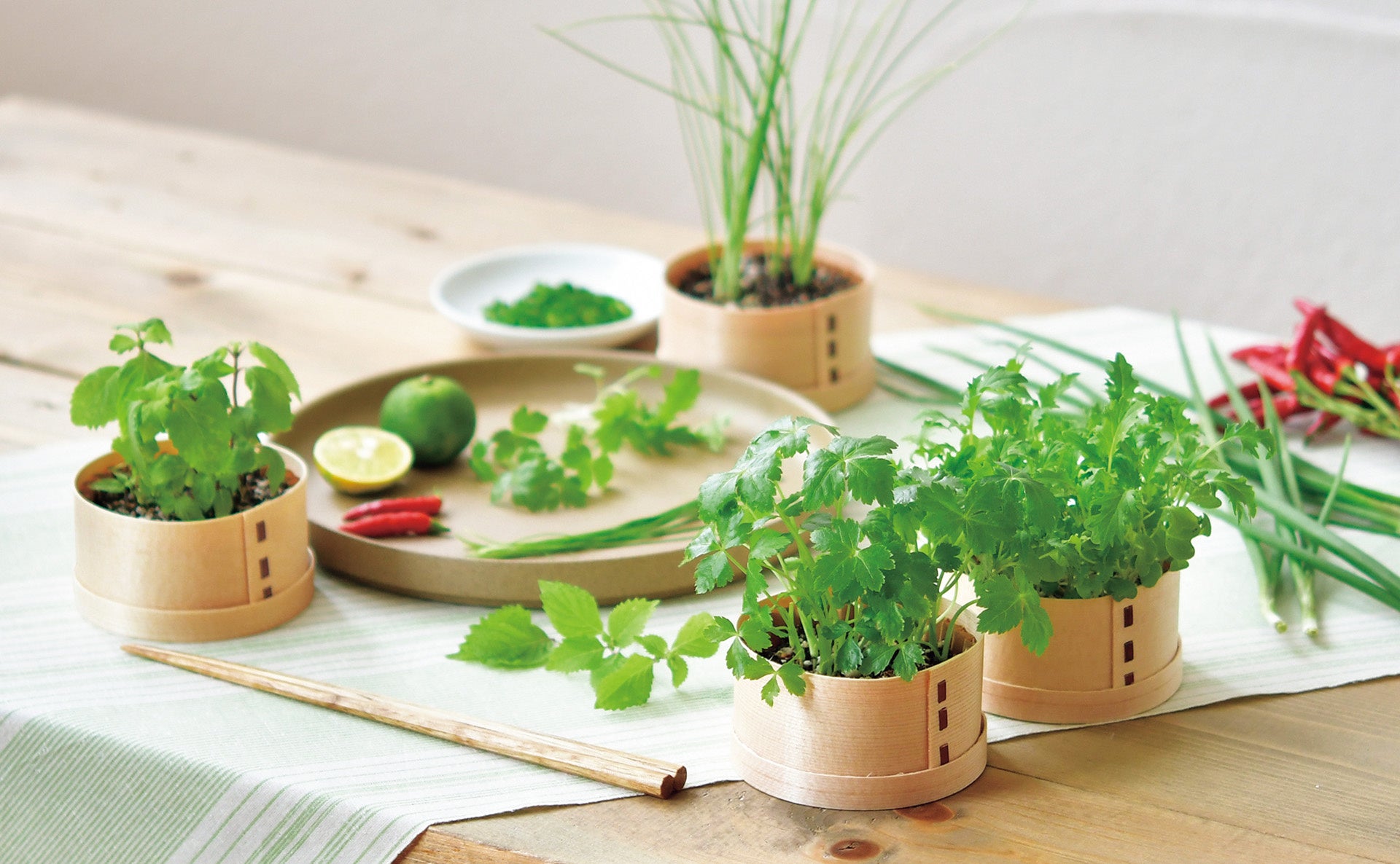 軽量タイプのわっぱは、和食で活躍する植物を育てるのにぴったり。
