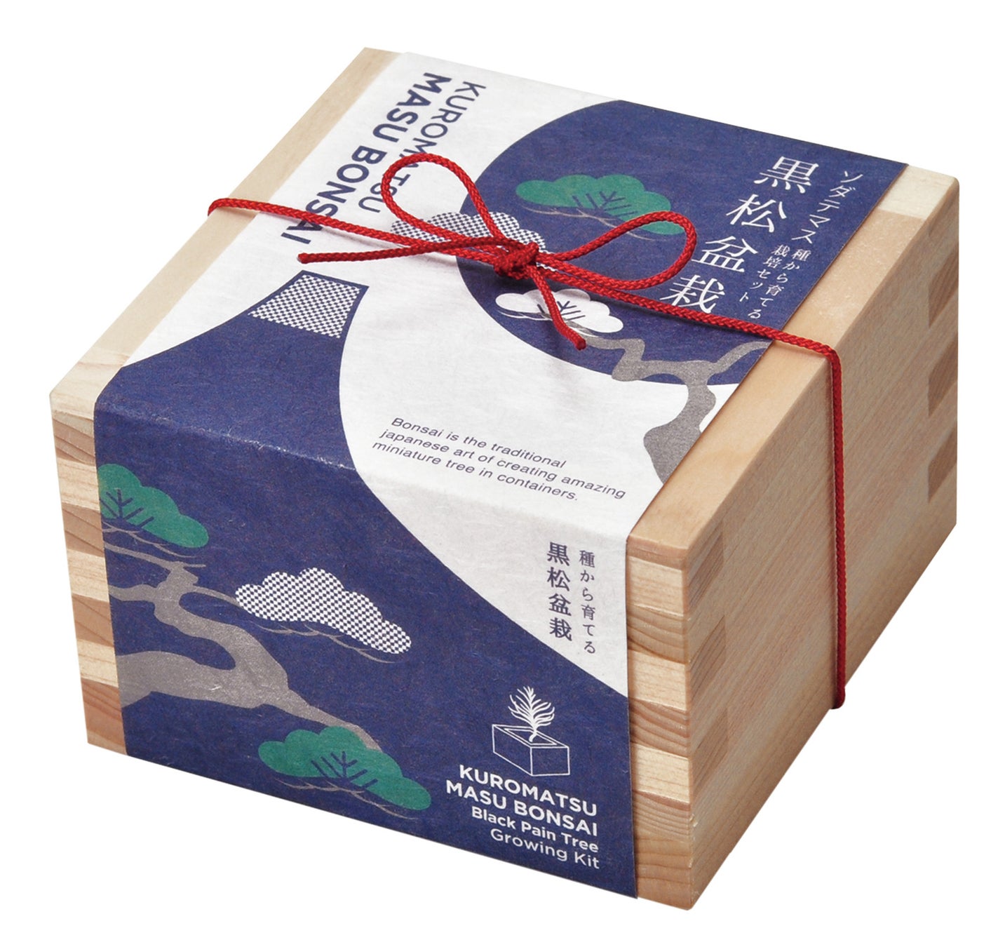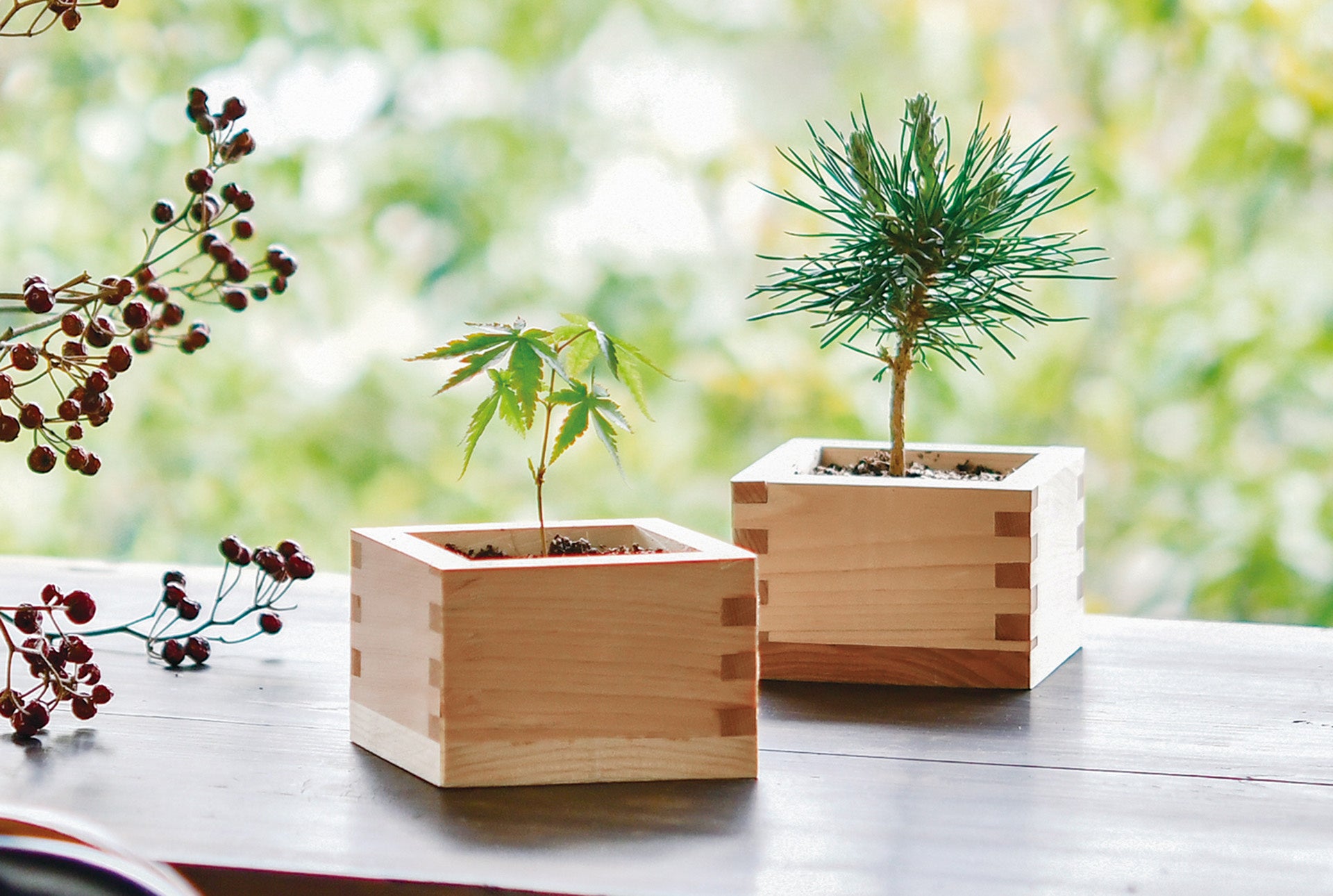 ヒノキ枡で小さな樹木を育てる盆栽栽培セット。