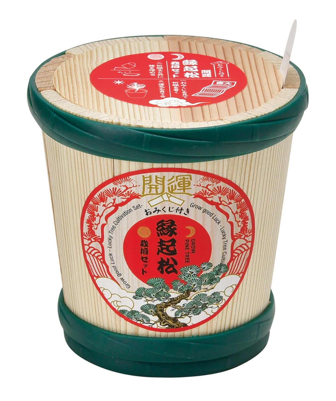 門松や水引などおめでたい日にモチーフとして使われることの多い松は、冬でも青々とした常緑樹で、昔から「不老長寿」「繁栄の象徴」「新しい生命力の象徴」といった、縁起のいい植物として愛されてきました。運試しをした後に新年の抱負や願い事などを書き、タネと一緒に土に植え、運気と一緒に縁起のいい松を育てます。「松が育つ頃に成就していますように」という想いを、樽のおめでたいイメージにかけ合わせ仕上げています。[ https://seishin-plus.ocnk.net/product/492 ]