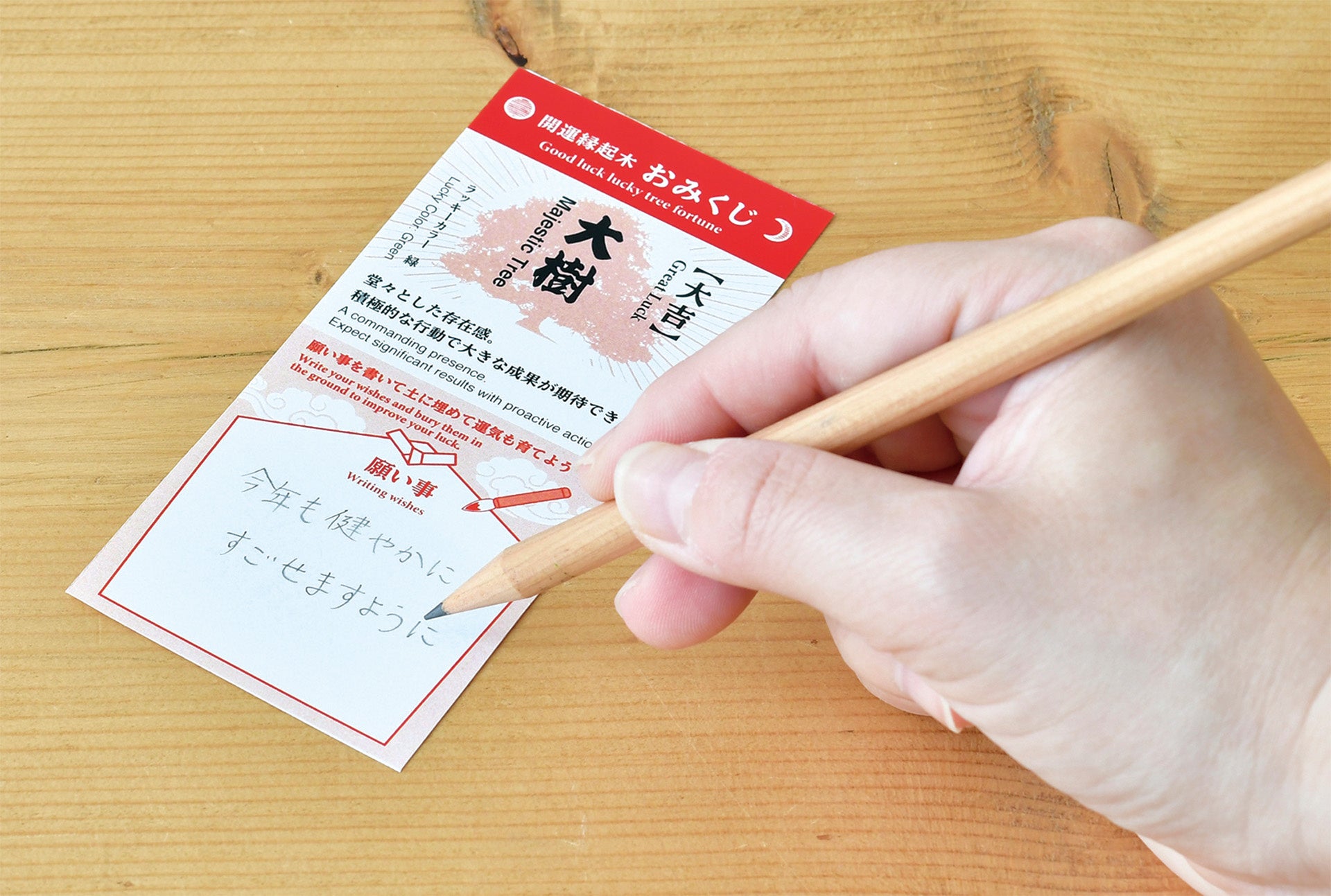 「大吉」「中吉」「吉」「小吉」「末吉」が描かれたおみくじに願いを書き、種と一緒に植えます。栽培に必要なものがワンセットになっているので、お手軽に植物の栽培が始められます。ミニ樽は間伐材を利用しています
