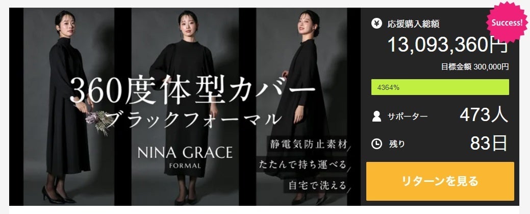 株式会社NINAは、服づくり一筋47年の婦人フォーマル専門メーカーです。すべての女性に新たな価値とそれを手にする喜びをお届けすることを使命として、オリジナルブランド「nina’s」「NINA GRACE」を立ち上げ、伝統的なフォーマルウェアと現代のスタイルを融合したブラックフォーマルを作り続けてまいりました。 時代のニーズを取り入れた新しいプロジェクトをmakuakeにて先行販売いたします。ぜひ応援のほど宜しくお願いいたします。