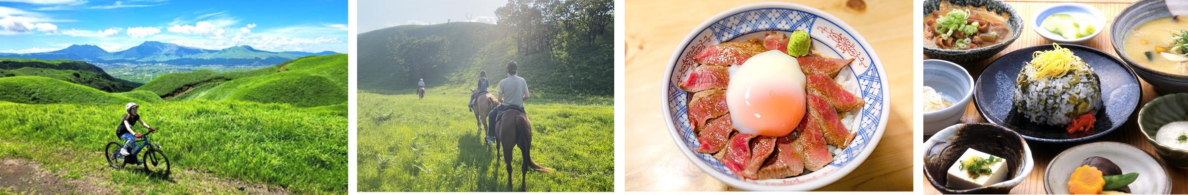 阿蘇の雄大な大草原をe-BIKEで走ったり、地元の名店で地域の食材を使った伝統料理を堪能したり。移動も食事も遊びも宿泊も、旅するだけで、自然や地域がうれしくなるものを詰め合わせ。手軽に楽しみながらも、未来に向けての学びや気づきも得られるツアーです。