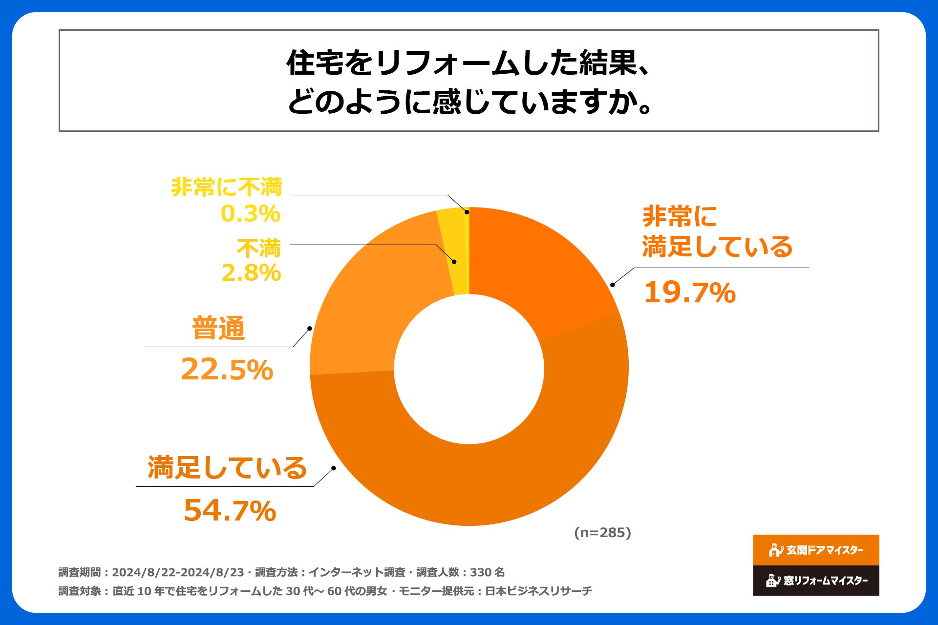 次に、住宅のリフォームを業者に依頼したと回答された方に「住宅をリフォームした結果、どのように感じているか」を尋ねました。この設問の回答では、1位が「満足している」で54.7%、2位が「普通」で22.5%、3位が「非常に満足している」で19.7%という結果になりました。この結果から、大半の方が業者に依頼した住宅リフォームの結果に満足されていることがわかりました。