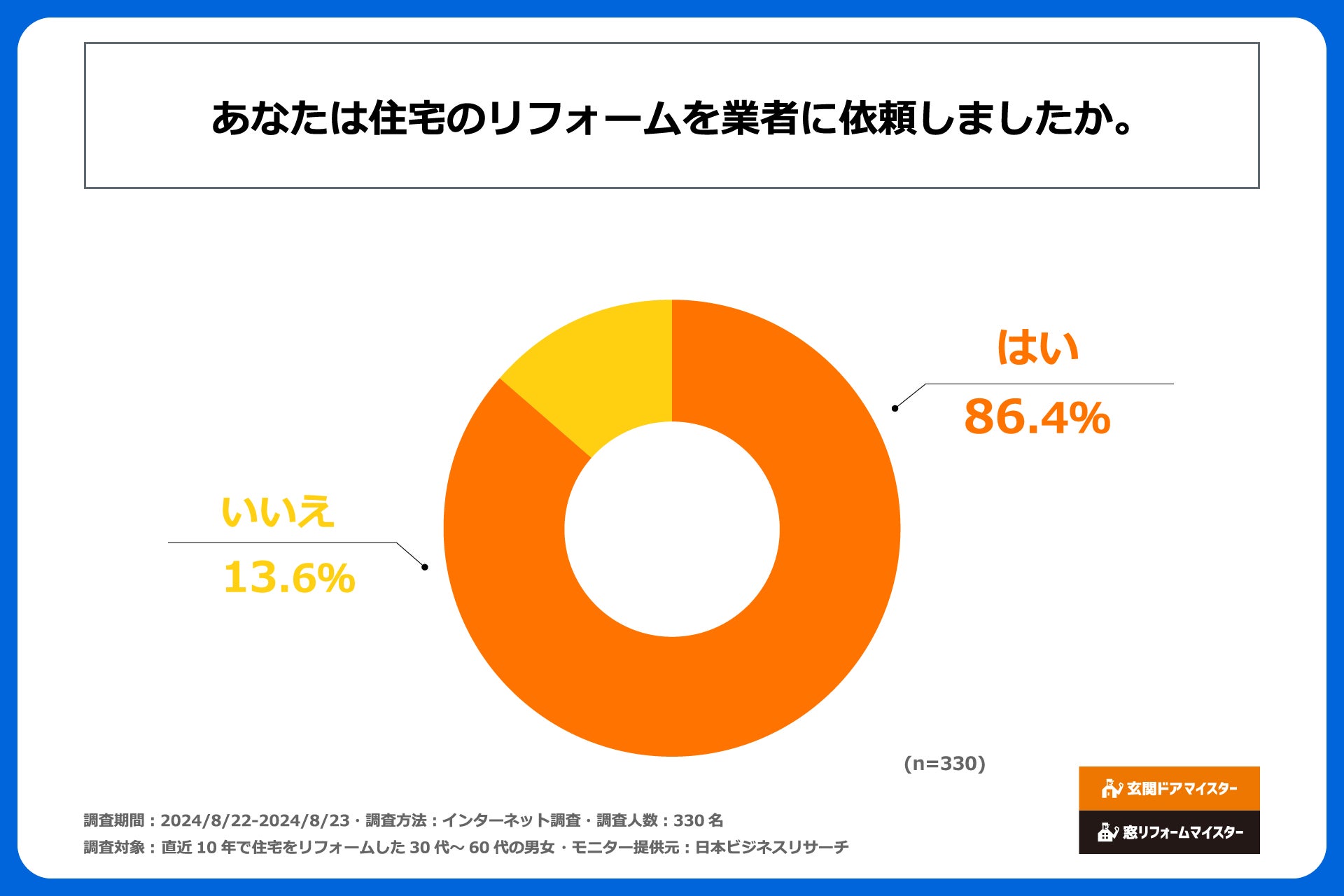 まず、「住宅のリフォームを業者に依頼したか」を尋ねる設問への回答では、「はい」が86.4%と大半を占める結果になりました。30代~60代の持ち家に住む方の大多数が、住宅リフォームは専門の業者に依頼していることが明らかになりました。