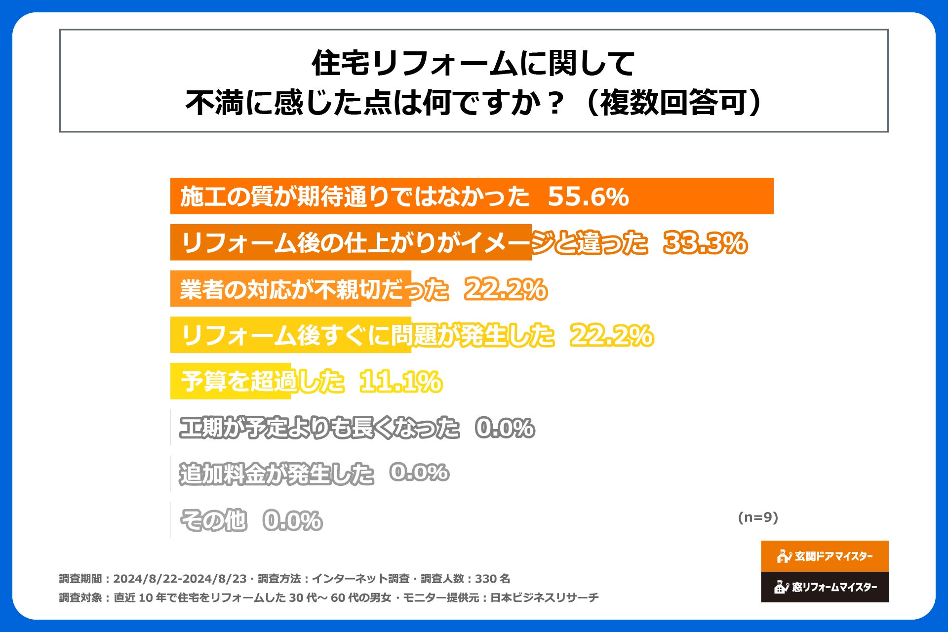 続いて、前問でリフォームした結果に対して「不満」および「非常に不満」に感じていると回答された方に「住宅リフォームに関して不満に感じた点は何か」を問いました。この設問への回答で最も多かったのは「施工の質が期待通りではなかった」で55.6%、次いで「リフォーム後の仕上がりがイメージと違った」で33.3%となりました。この結果からいずれも施工の質に関する不満が多いとわかりました。