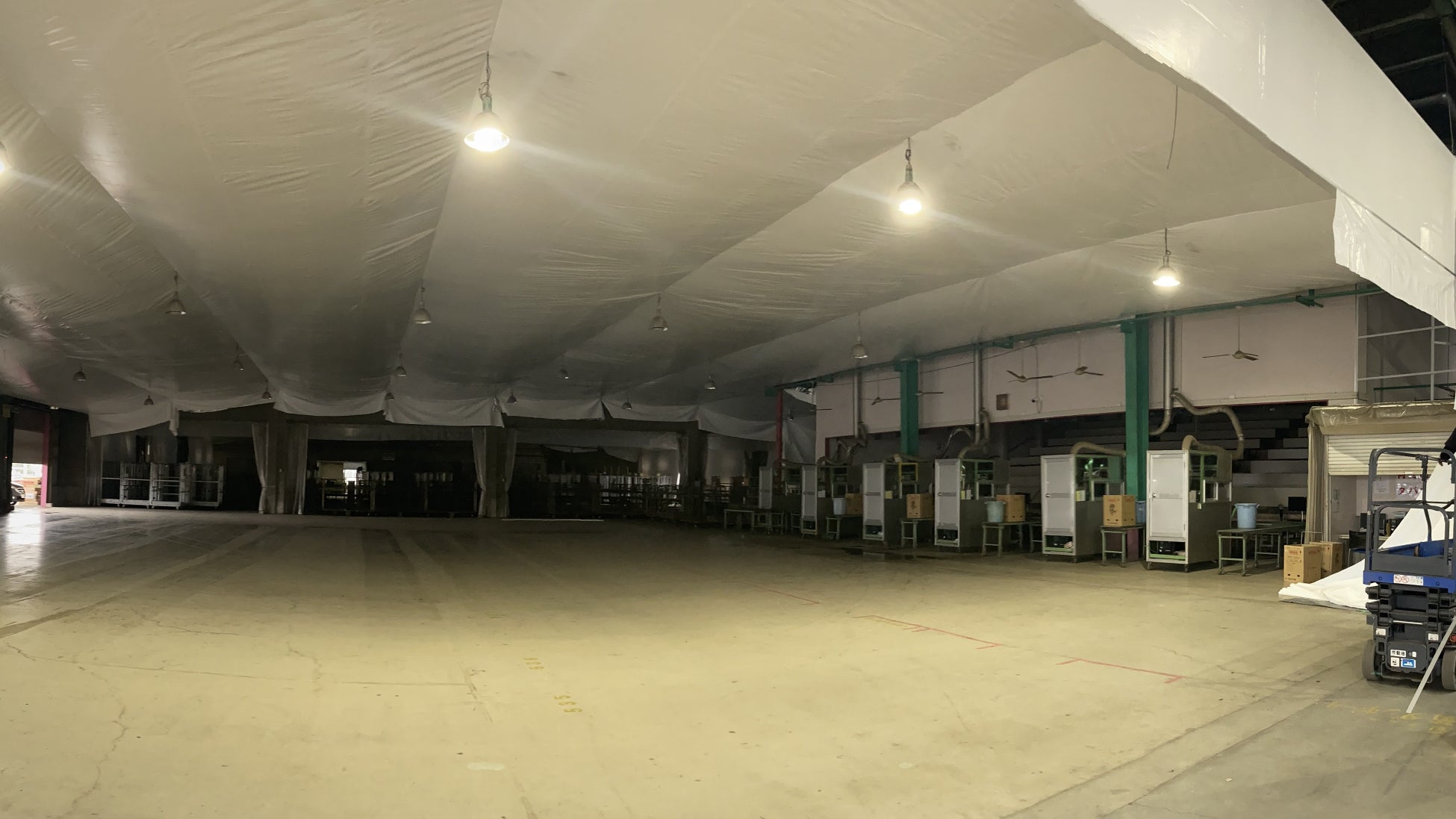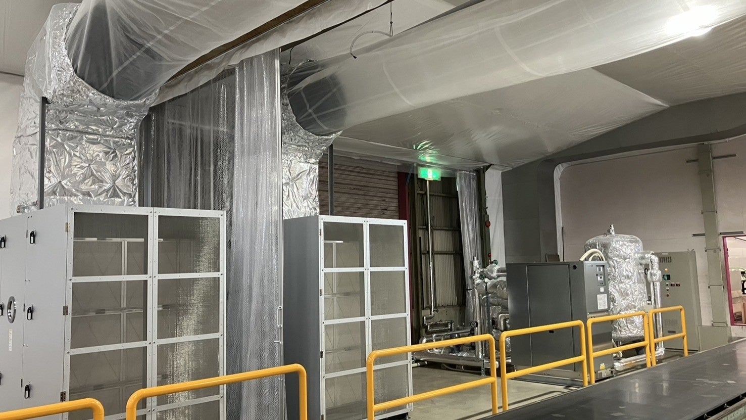 1. 空調効率を高める間仕切り施工:「サーチェス™」では、地中熱源空調の設置のみならず、空調効率を高める間仕切り施工まで一括施工管理が可能です。花市場内の空調エリアの間仕切りと天井には、外側に遮熱シート、内側にビニールシートの二層構造のシートを施し、断熱・機密性能を強化し、空調負荷を約5分の1に低減しました。