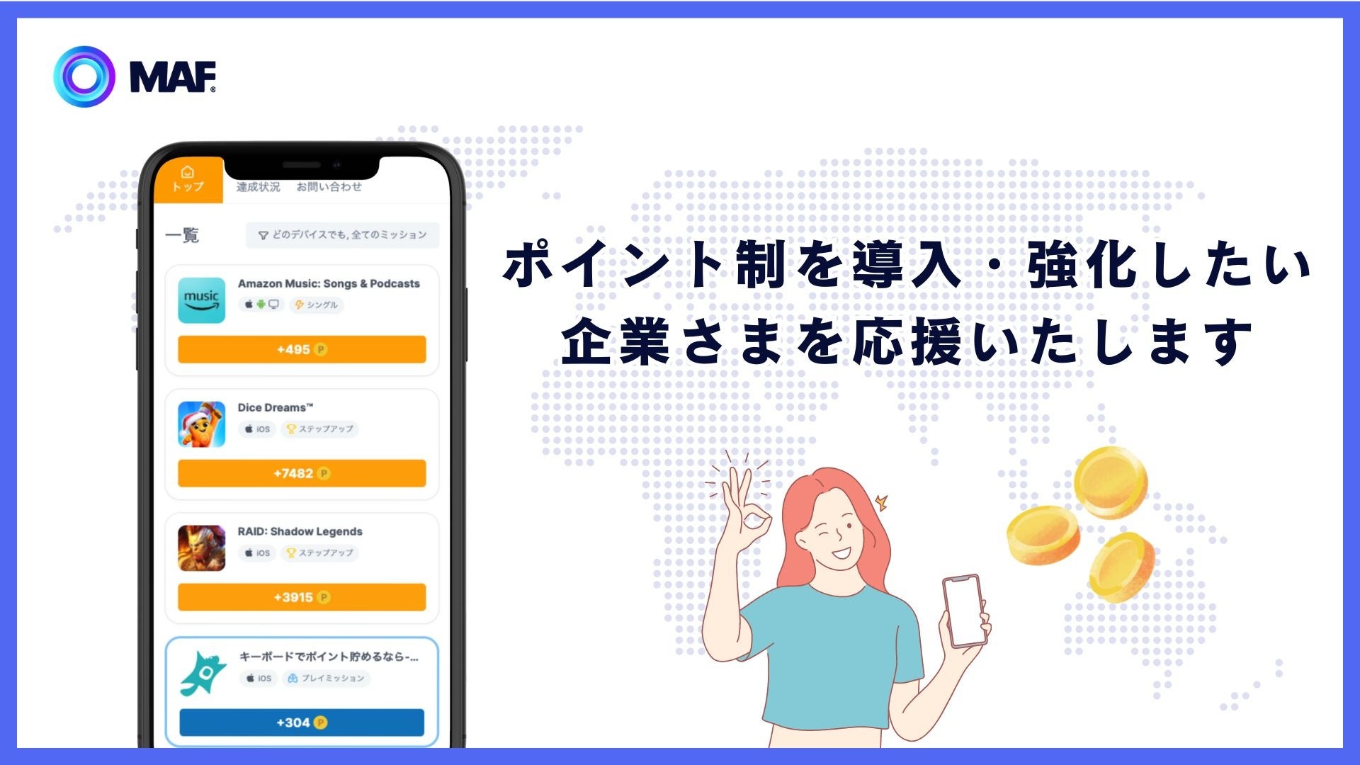 MAF(エム・エー・エフ)はメディアのマネタイズを支援する、自社の「オファーウォール開発」とオファーウォールを導入済みの提携メディアを通した広告配信、ゲームパブリッシング事業、自社メディア運営など、アプリのマネタイズと事業成長を支援するオールインワンソリューションを提供しています。
