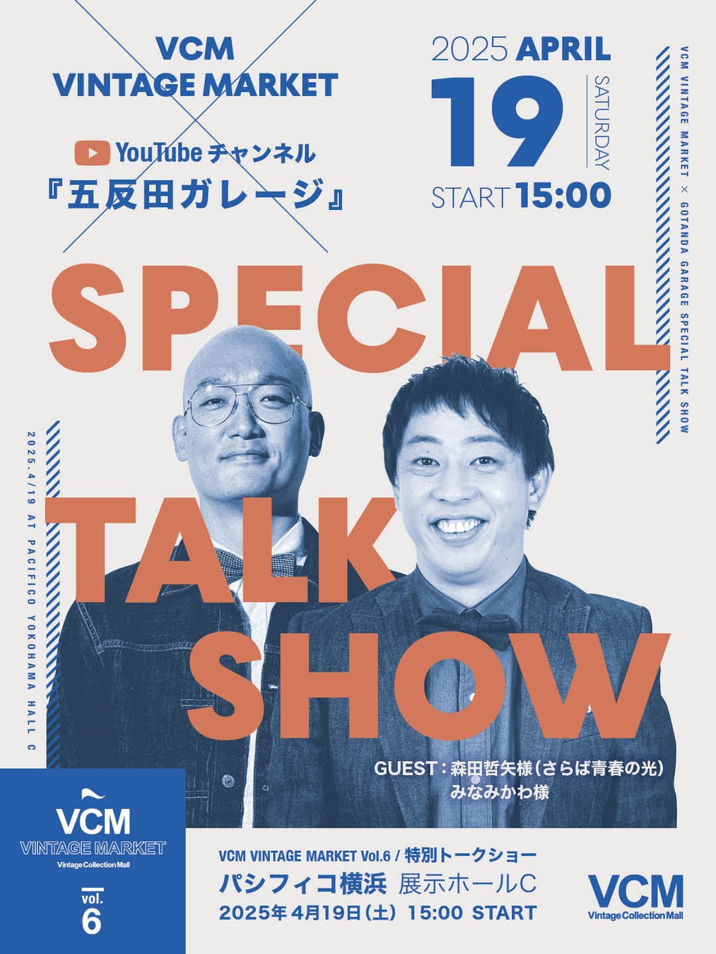 VCMともゆかりのある、YouTubeチャンネル『五反田ガレージ』より、森田哲矢様(さらば青春の光)、みなみかわ様をゲストにお招きし、VCM代表 十倍直昭を交え、会場内特設ステージにてヴィンテージにまつわる様々なトークを繰り広げます。