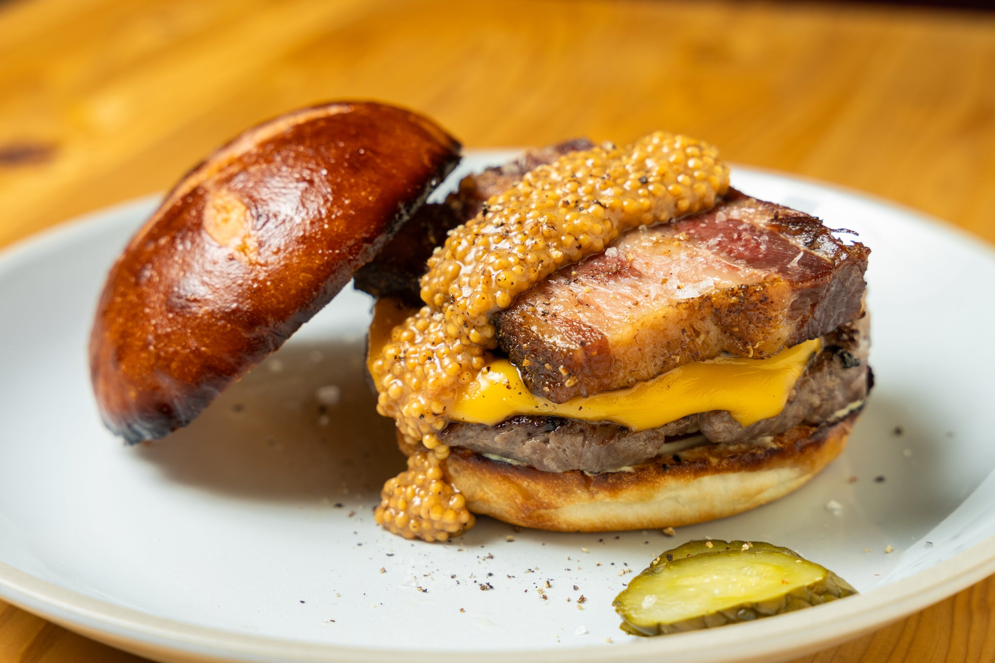 人形町の名店「BROZERZ」本店で3年半料理長を務めた後、芝浦で経験を積み独立。ハンドチョップで1.5~2cmにカットしたパティは、肉の食感と噛んだときに広がる旨みを追求し、まるでステーキのような食べ応えを実現。マヨネーズは卵から、ケチャップやマスタード、各種ソース、ピクルスまですべて自家製。作れるものはすべて自らの手で仕込み、一切の妥協を許さないこだわりが随所に宿る。