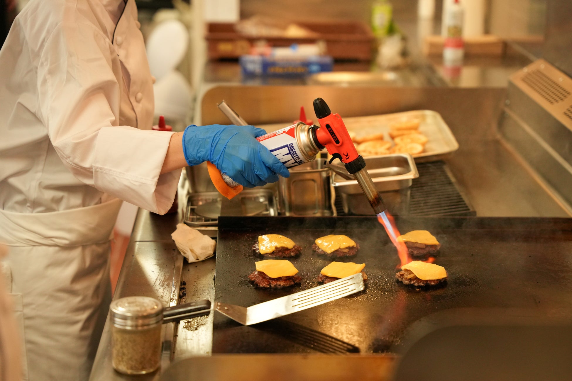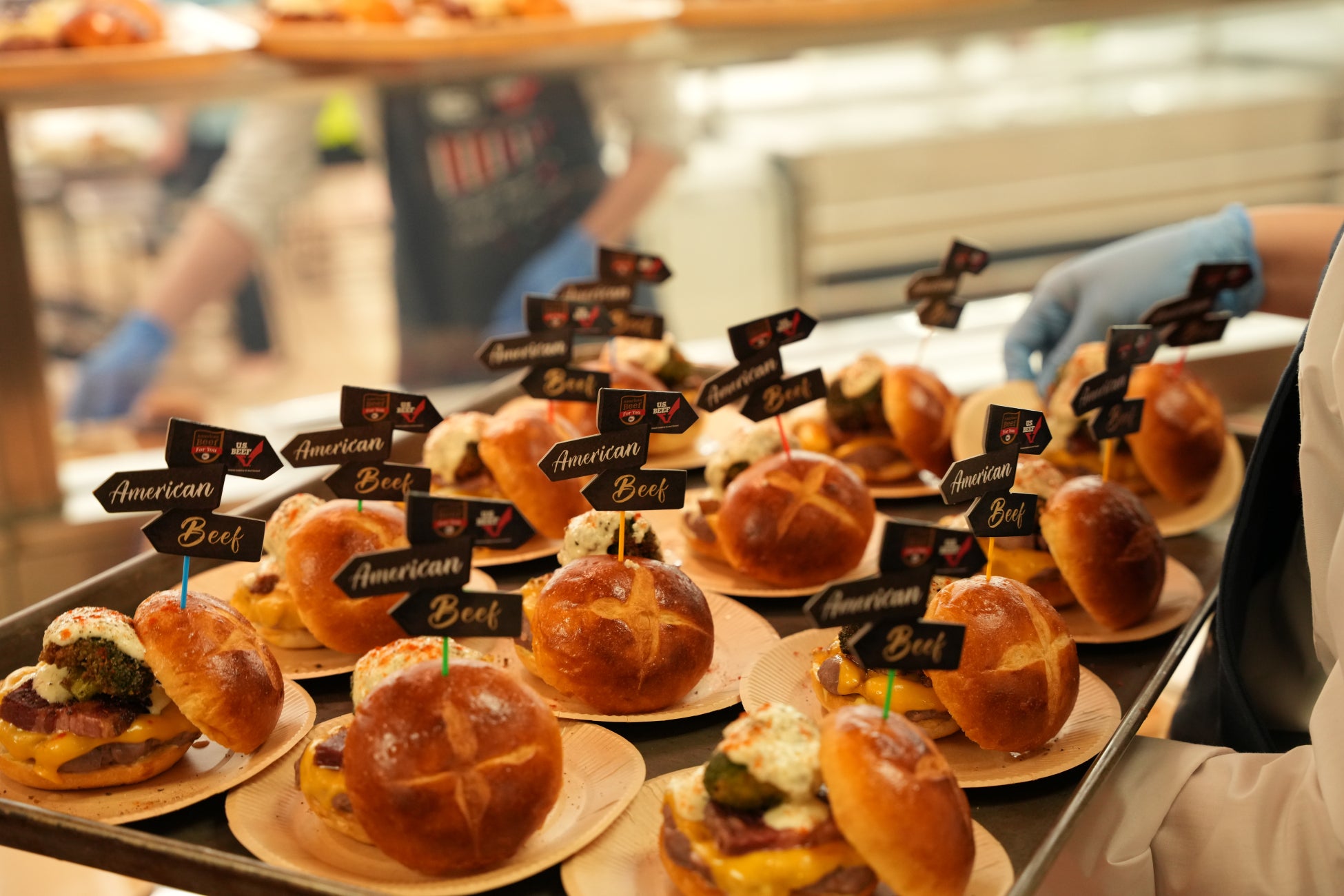 試食前、大使館内カフェテリアでは、各参加店舗のシェフが丹精を込めてアメリカンビーフ100%のパティを使用したハンバーガーを調理。肉の焼ける香ばしい香りが広がる中、こだわりの技と味を存分に披露していました。