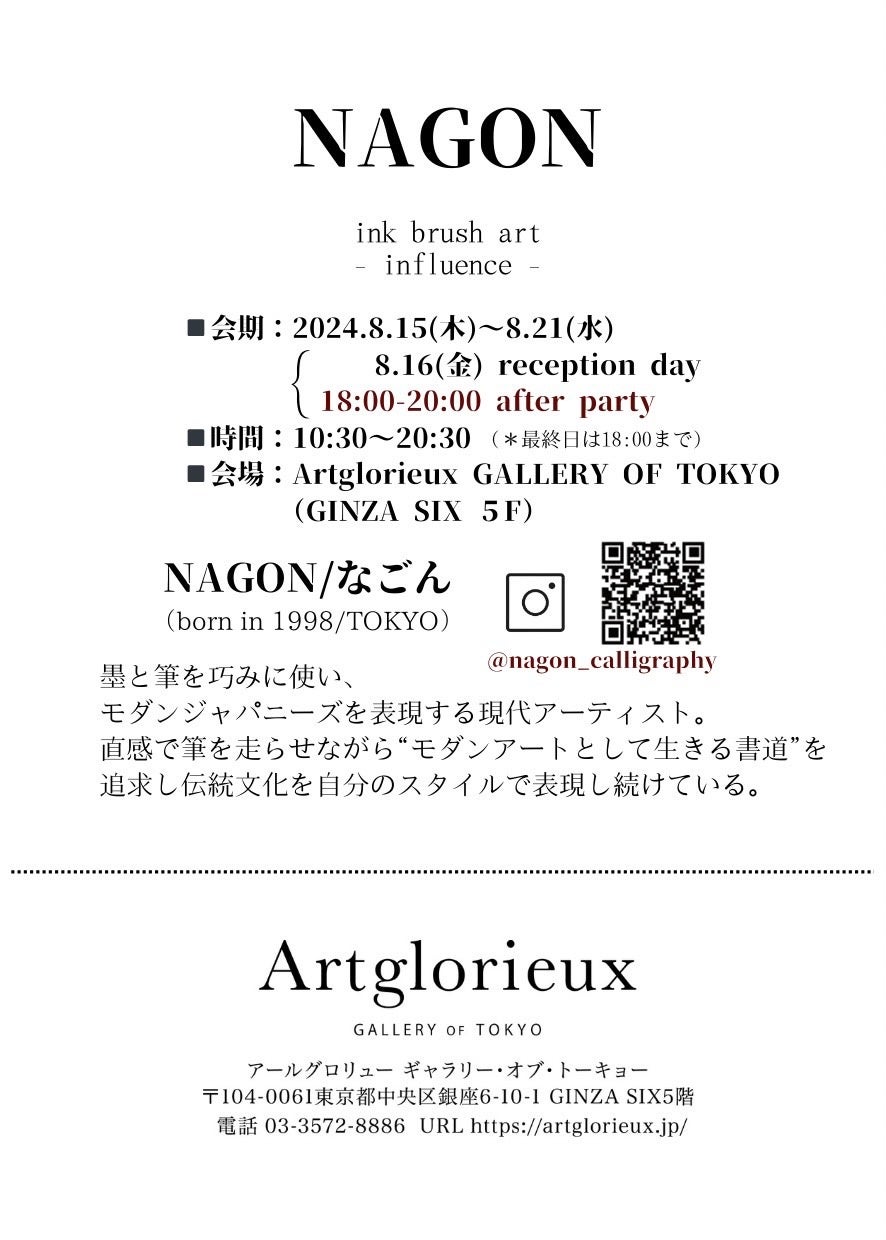 現代アーティストのNAGON/なごん(ディッシュ所属)が、2024年8月15日(木)から21日(水)まで、Artglorieux GALLERY OF TOKYO(東京・銀座)にて、個展「NAGON solo exhibition ink brush art - influence -」を開催します。