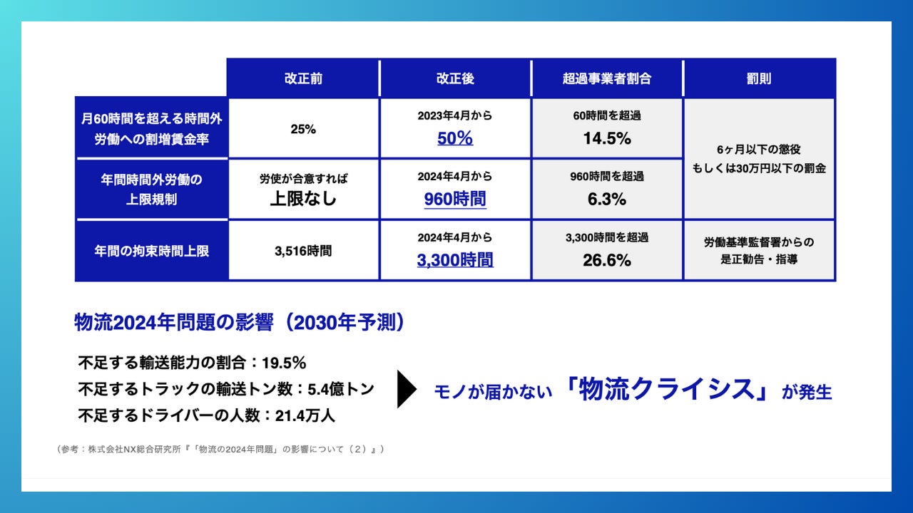 2024年の4月から施行される働き方改革関連法の改正など、物流業界の状況は近年大きく変化しており、時代の変化に応じて様々な課題に直面しています。