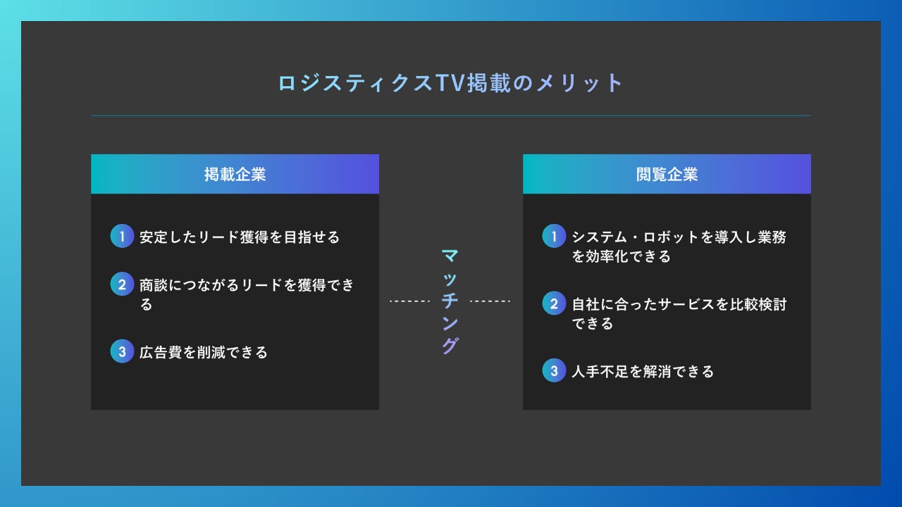 株式会社マトリクス(本社:東京都港区、代表取締役:三村幸平、以下「マトリクス」)は、2024年12月9日(月)、物流テックに特化した動画マッチングプラットフォーム「ロジスティクスTV」の提供を開始いたしました。物流に関するソリューションを提供する企業の情報を発信し、業界全体のDX推進、人材不足解消に寄与してまいります。
