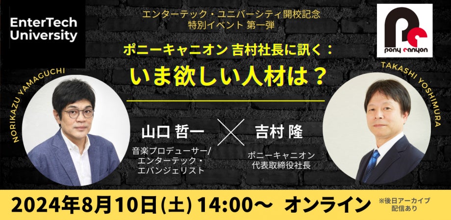 スクールの開校を記念し、エンターテック・ユニバーシティ構想段階から賛同の意志を表明されていた、株式会社ポニーキャニオン 代表取締役社長の吉村 隆さまをゲストにお迎えし、「これからの日本の音楽業界を背負う人材」について、エンターテック・ユニバーシティの設立者であり、学校長を務める山口 哲一が本音をお伺いするオンラインイベントを開催いたします。(後日、アーカイブ配信も行います。)