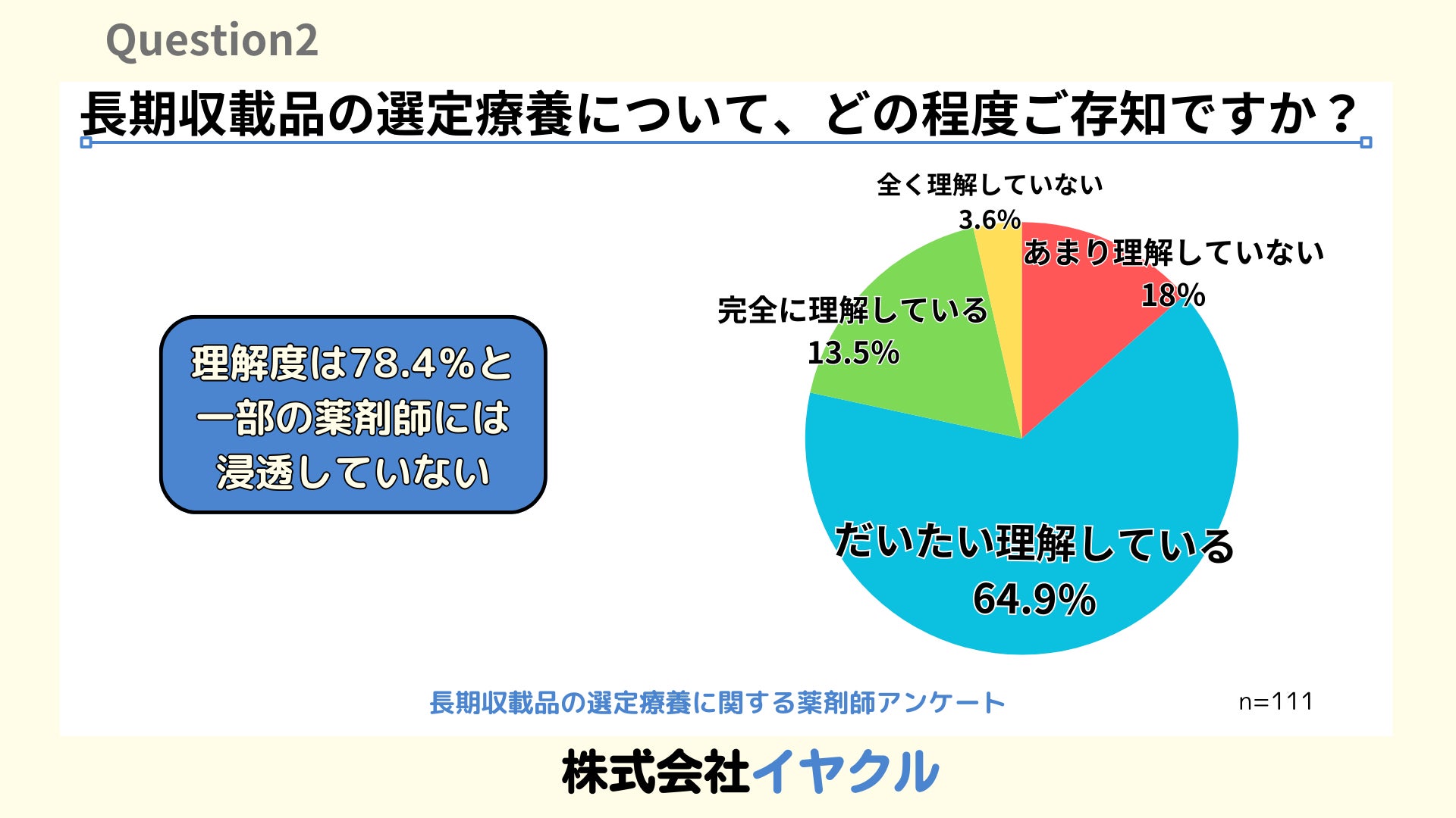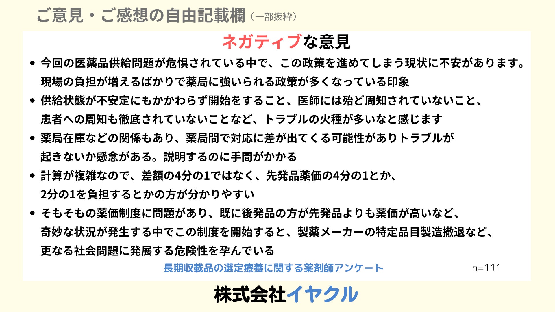 株式会社イヤクル(本社:北海道枝幸郡浜頓別町、代表取締役:佐孝尚)は、2024年10月1日から導入される選定療養制度に関して、株式会社イヤクルの医薬品ロス解消プラットフォーム「イヤクル」ユーザーと株式会社APOSTRO、株式会社ネグジット総研、株式会社Kaeマネジメントの4社合同による薬剤師を対象にした意識調査を実施しました。この調査には111名の薬剤師が参加し、選定療養制度に対する理解度や制度導入に伴う業務への影響が明らかになりました。本調査では、患者負担の増加や薬剤師の業務負担が懸念される一方、医療費の抑制と後発医薬品の使用促進に対する期待も浮き彫りになりました。