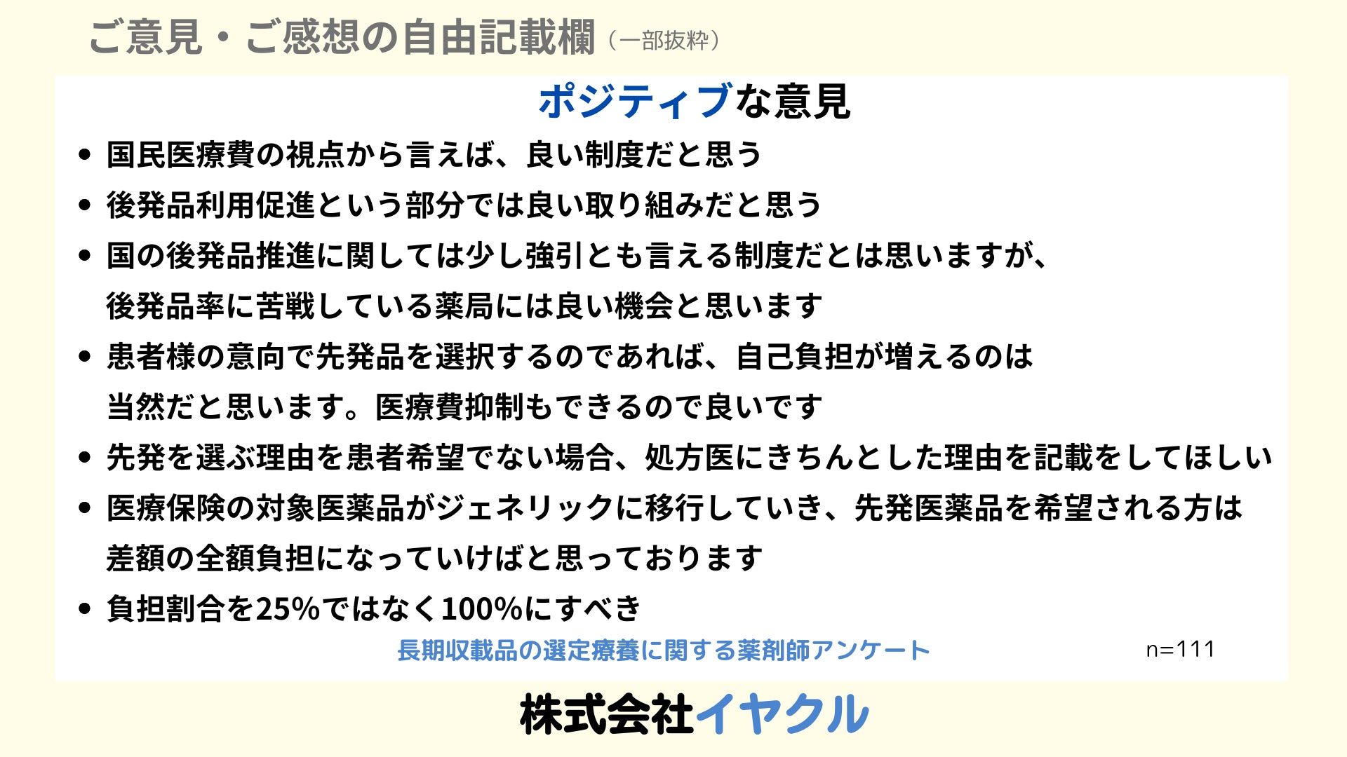 自由記述欄からは、薬剤師が制度導入に対して感じている具体的な声も集まりました。「医療費抑制には良い制度だが、現場の負担増が心配」「患者の希望で先発品を選ぶ場合、説明が難しい」といった意見が寄せられ、制度に対するポジティブな期待とネガティブな懸念が交錯しています。