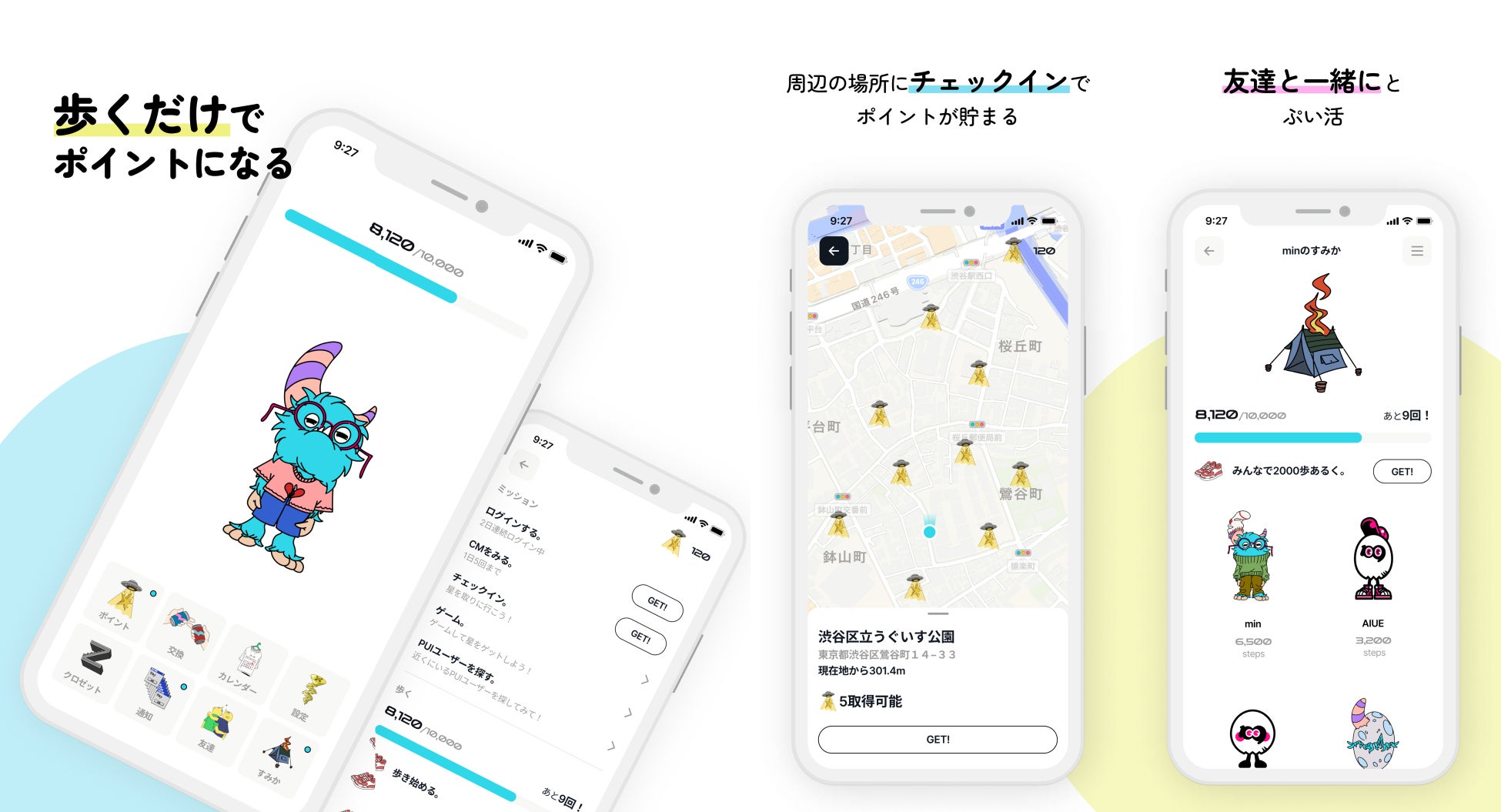 ユーザーは歩くことや近くのスポットにチェックインする、友達とグループで歩数を達成する、カジュアルゲームをプレイするなど自分のペースで無理なくリワードを楽しめます。