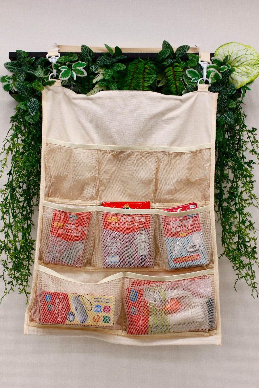 いざという時に持ち出したい避難用グッズを、常に見える場所に収納できる壁掛けタイプの防災ラックです。くるくると丸めれば肩掛けもできるので持ち運びにも便利なのに加え、ポケット別収納なので賞味期限切れなどのチェックも簡単。デコレーションにてタペストリーのように飾ることもできます。
