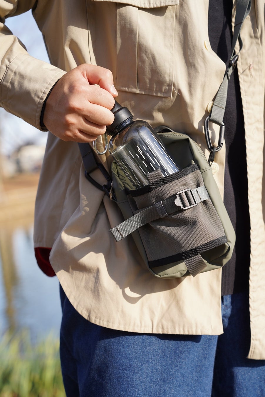 バッグ正面にストレッチ性のある生地を使ったオープンポケットにペットボトル等を収める事ができます、ベルトによる調節も可能になっておりこのサイズ感のショルダーでは珍しい仕様となっております。