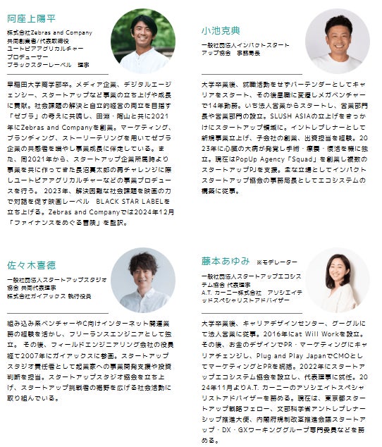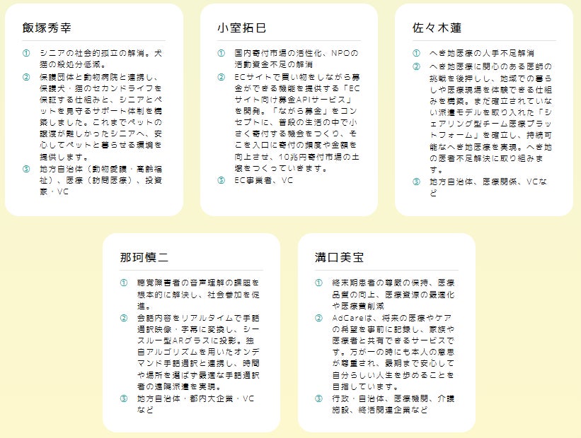 「社会的インパクト」と「経済的リターン」が両立する企業の創業を目指す採択者(5名程度)が、スタートアップスタジオ型の伴走支援による成果を発表します。※登壇者数は今後変更する可能性があります。