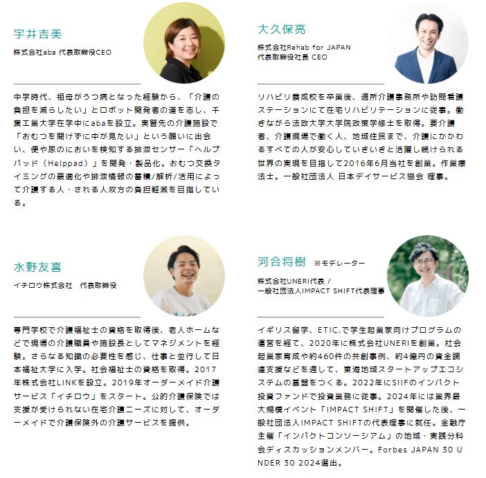 「社会的インパクト」と「経済的リターン」の両立を目指す企業として、介護業界で実際に起業し、トラクションを獲得して成長を遂げてきたスタートアップのブレイクスルーポイントについてディスカッションを行います。起業背景や、社会起業家が顧客や課題、ソリューションの特定等をどのような順序で、どのような思考・アクションで行ってきたか、マネタイズに至るまでのハードシングスなど現在に至るまでのプロセスを紐解きます。