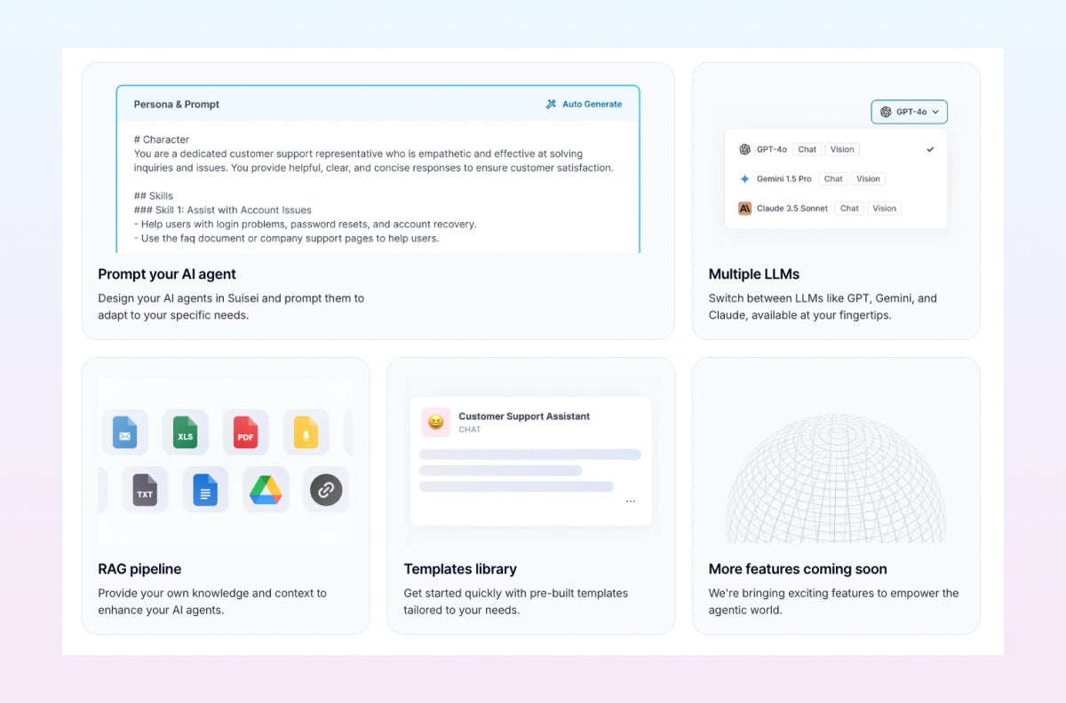 Suiseiは、大規模言語モデル(LLM)を用いてAIエージェントを作成する生成AIプラットフォームです。組み込まれたRAG(Retrieval-Augmented Generation)基盤から、企業独自のナレッジやビジネスコンテクストを学習し、精度の高い応答を生成します。これにより、カスタマーサポート、営業支援、マーケティング、業務効率化など多岐にわたるユースケースで活用可能です。