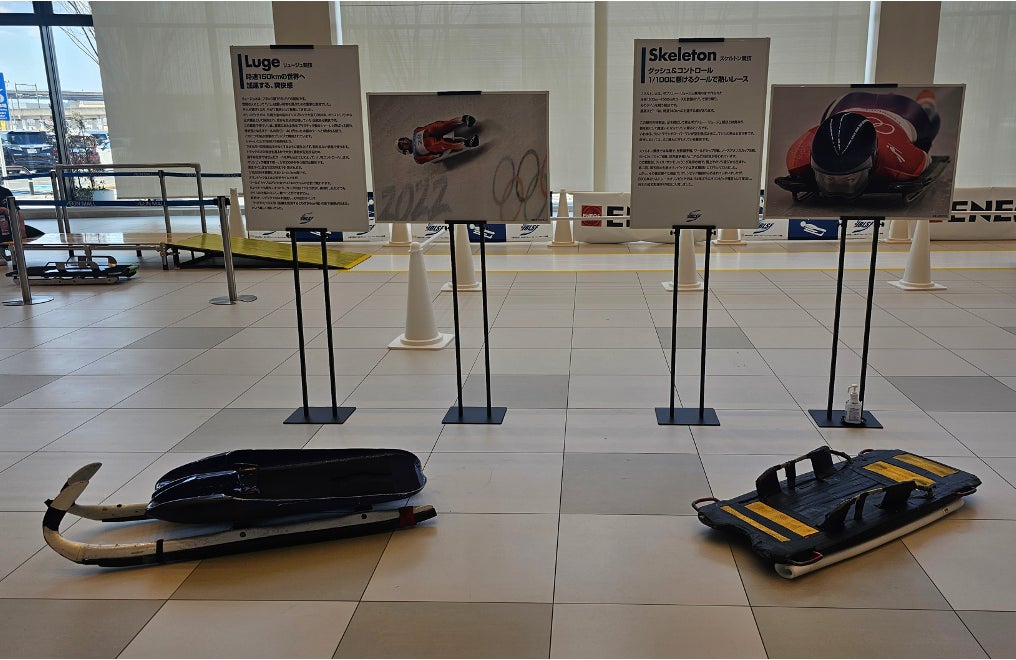 ボブスレー、リュージュ、スケルトンの実際の競技で使用する競技用ソリに加え、ヘルメット、ユニフォーム、グローブを展示します。実際にソリに乗り込んで写真撮影も可能です。