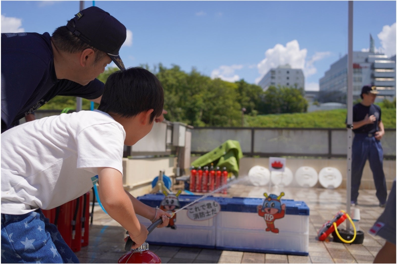永山北公園では、消防団による放水体験・ポンプ車乗車体験、水遊びエリア、大道芸ブースなどがあり、子どもたちに大盛況となりました。