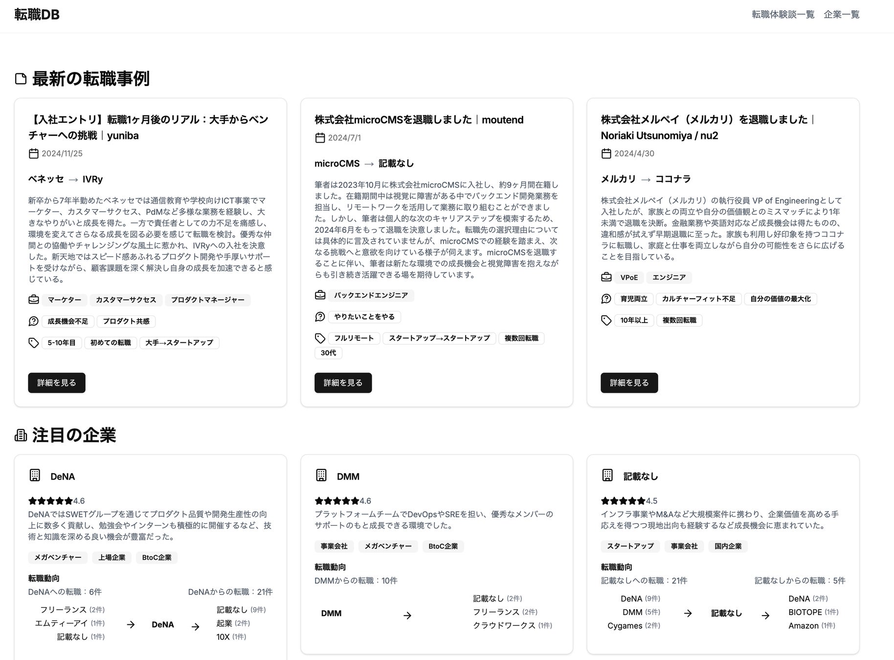 個人ブログ、note、Wantedlyなどから収集された転職エントリを一括管理し、端的に要約して表示。