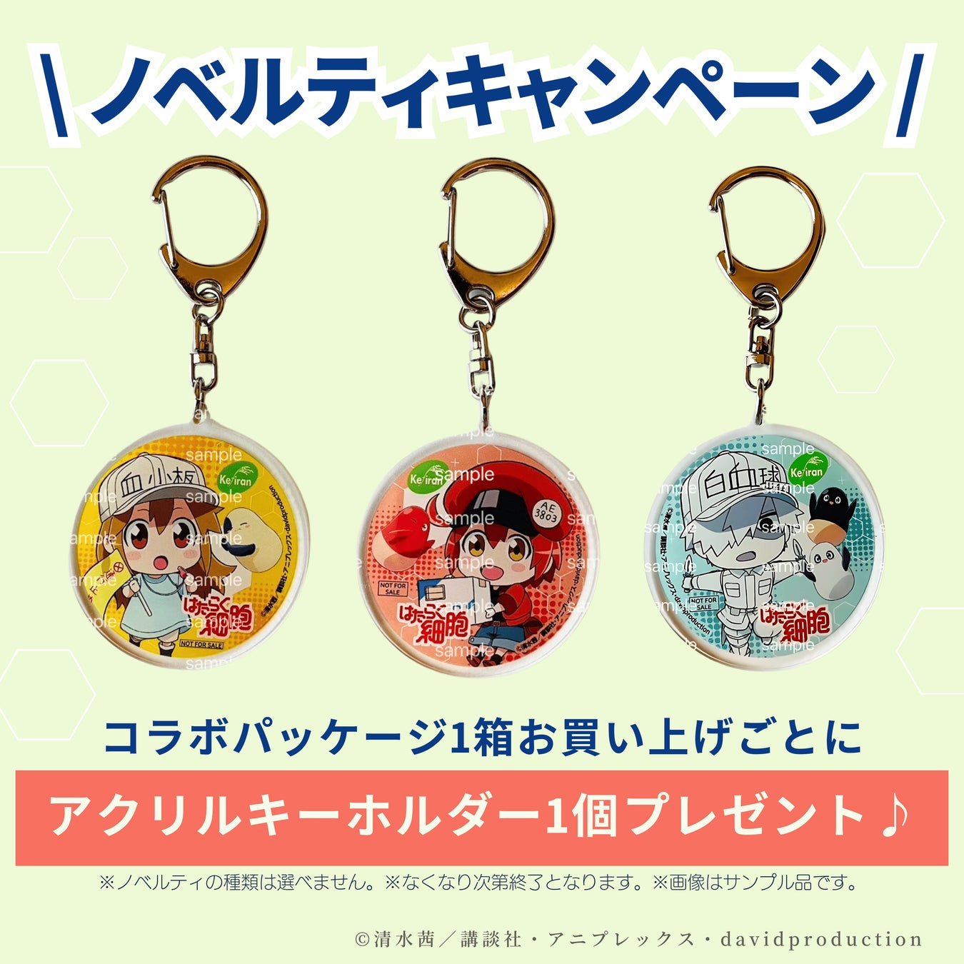 本企画を記念して、ケフィーラPlus取扱店にて当商品をご購入いただいた方に赤血球・白血球(好中球)・血小板に乳酸菌のキャラクターを組み合わせたオリジナルアクリルキーホルダー(全3種)をランダムで1つプレゼントします!