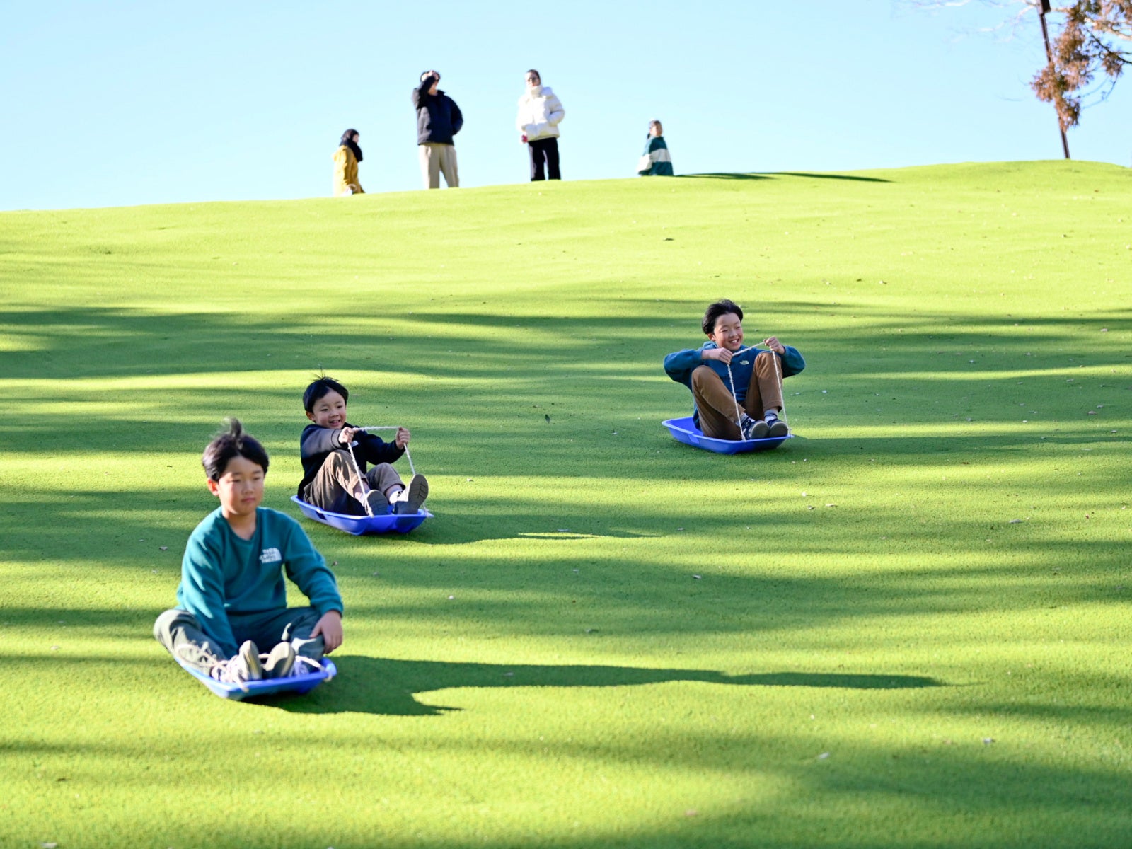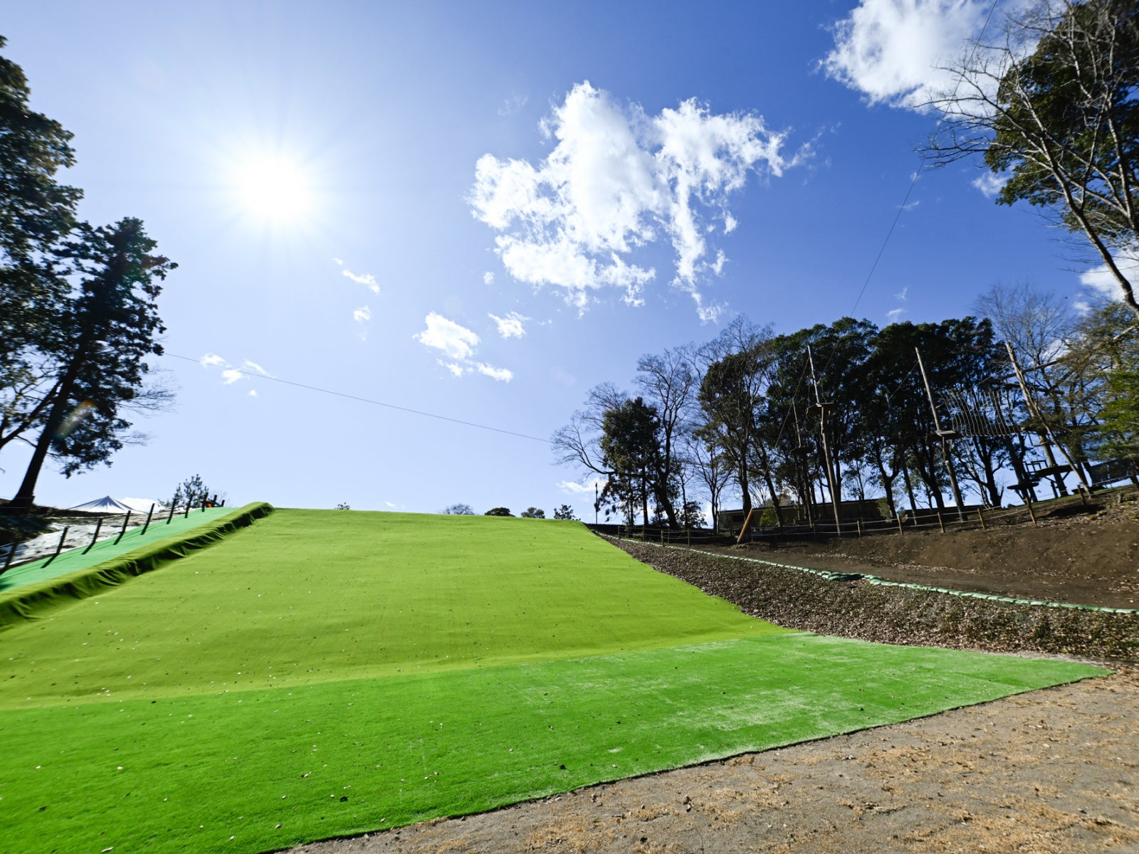 青空の下、緑の斜面を滑り降りるエキサイティングな芝すべり。風を切る爽快感と自然の広大さを全身で感じられます。