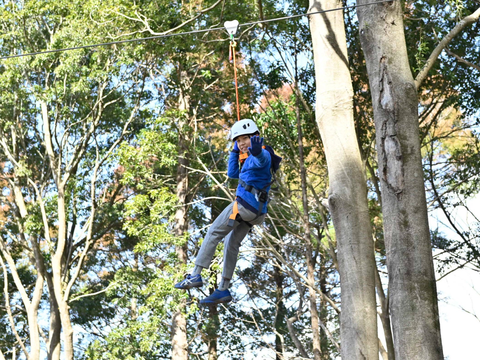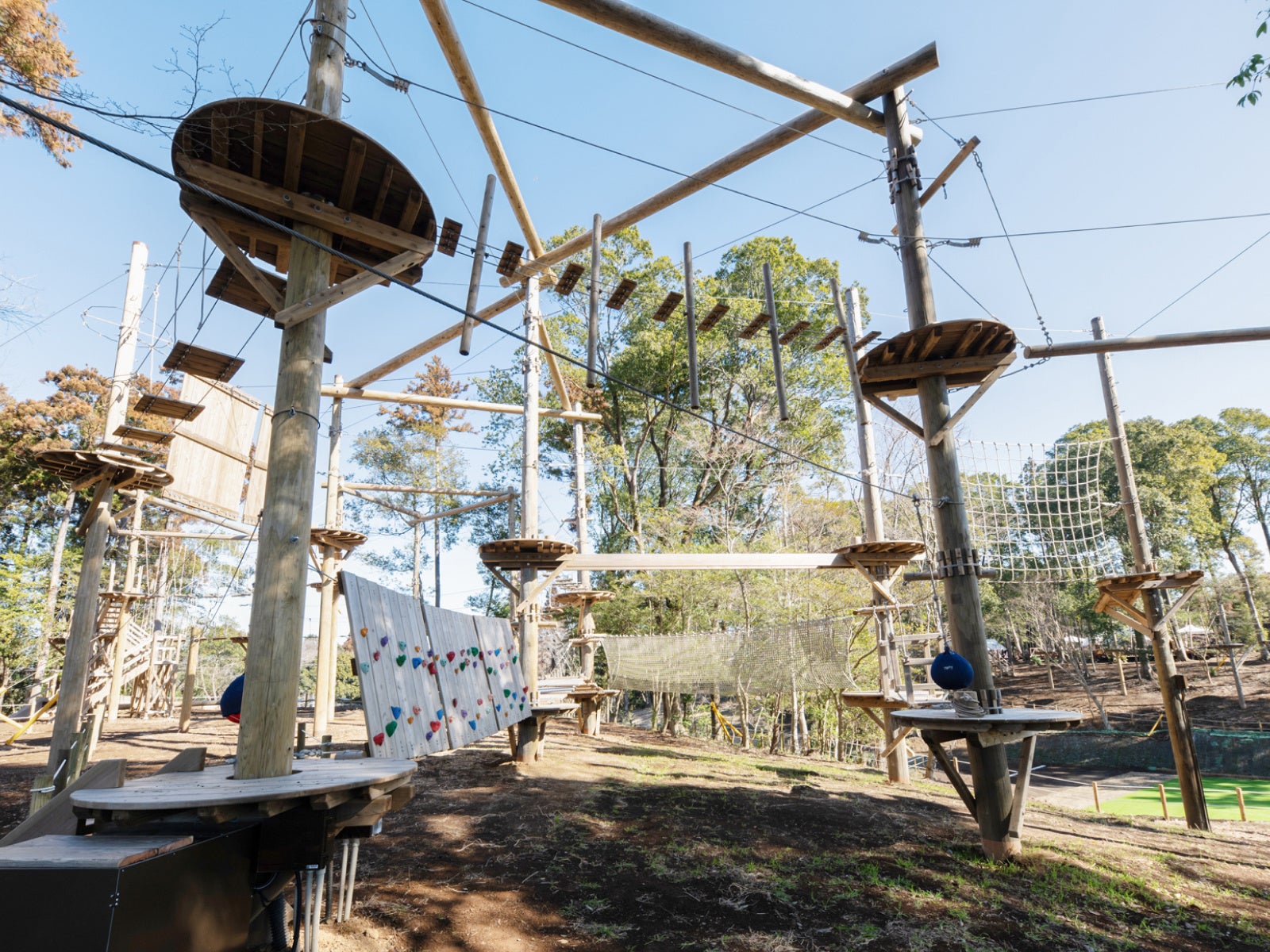 木の柱の上に設置されたロープや橋などの様々な障害物をクリアしながら進む屋外型アスレチックです。難易度が異なる5コースがあり、大人気のジップラインは最長100mで、全4箇所にございます。ハーネスやヘルメットを着用し、安全に楽しく空中散歩が可能です。未就学児対象のキッズコースは地上60㎝以上の高さがあり、保護者が伴走しながら一緒に楽しめます。