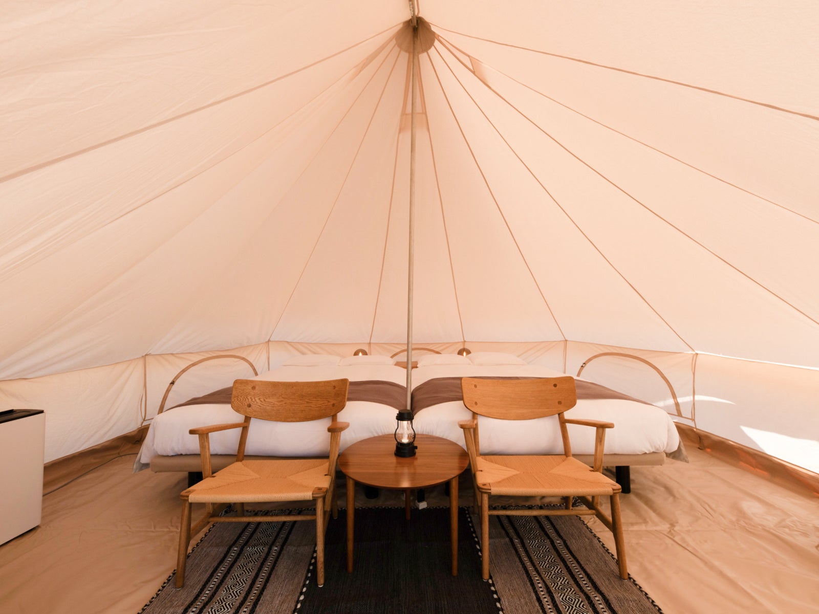 ・全3棟 ・デンマーク製「ノルディスク アスガルド」 ・ベッドタイプ:ダブルベッド2台 ・ご利用人数:4名まで ・専用ウッドデッキ:60㎡(内テント19.6㎡) |