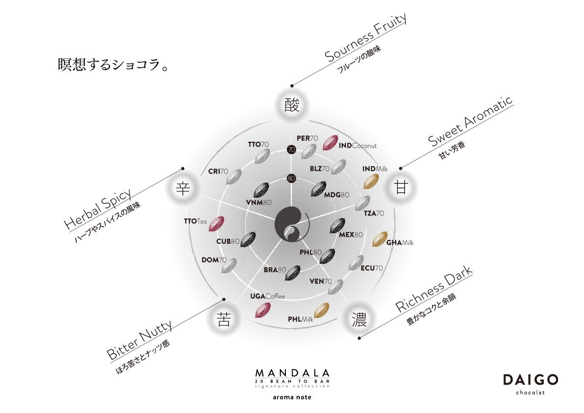 17カ国のカカオを使用し、中国古来の哲学思想である陰陽五行の五味をベースに「酸(フルーツの酸味)」「甘(果実や花の芳香)」「濃(豊かなコク)」「苦(ビター&スモーキー)」「辛(スパイスやハーブ)」に落とし込み、五感をフルに働かせて多様な味わいを感じていただけます。いままでとは、まったく違う出発点を持つショコラです。