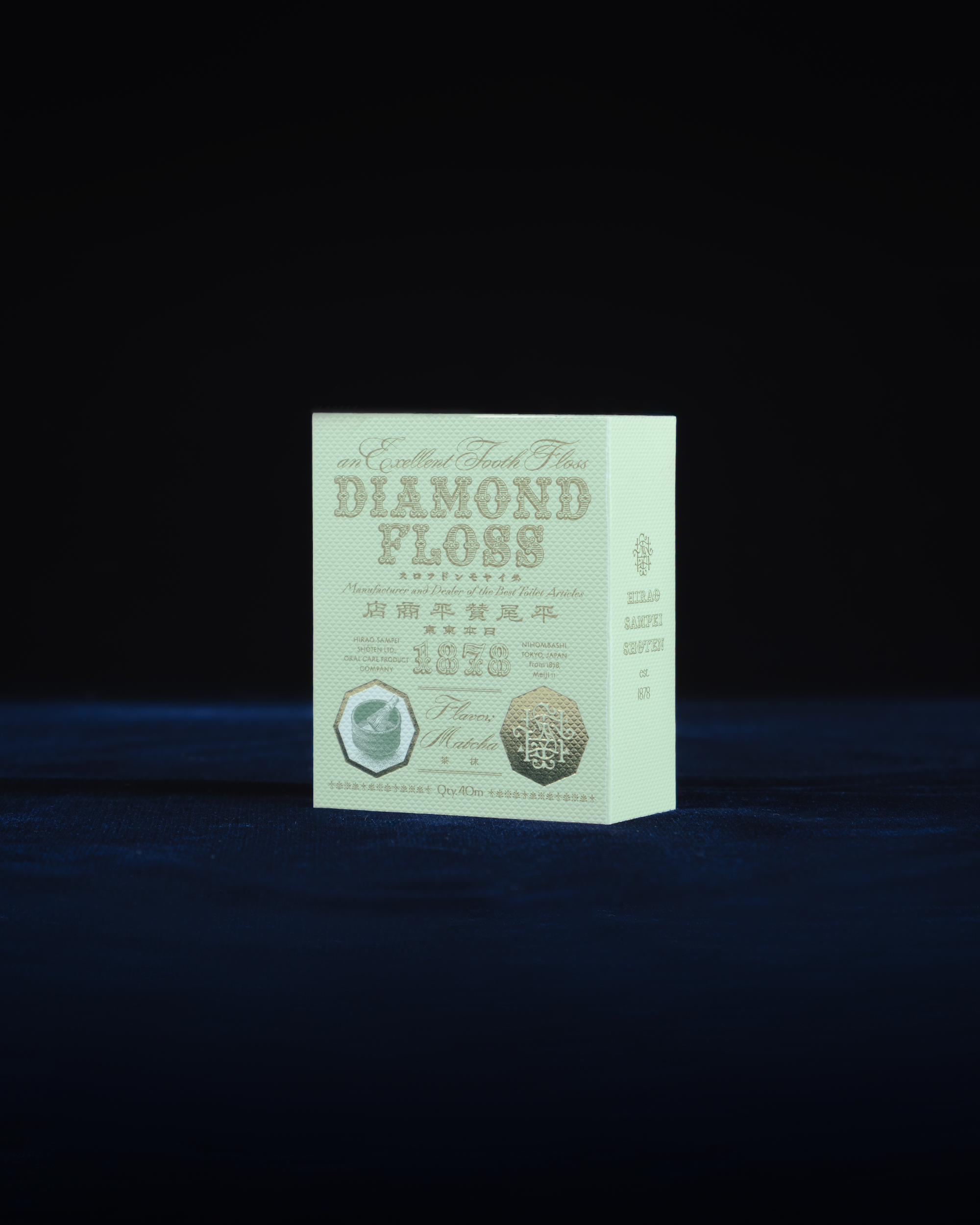 平尾賛平商店は、日本初の化粧水「小町水」、国産初の科学的歯磨き粉「ダイヤモンド歯磨」など、美しい意匠と優れた機能を併せ持った商品を世に送り出し、今日に続く日本の化粧文化の土台を形作ったブランドです。創業者の平尾賛平が、いち早く先端技術を商品に取り入れ、パッケージデザインにもこだわったことは記録にもありますが、おそらくそれは、機能が優れていても、手元に置いておきたくなる意匠でなければ、機能が無意味化することに気付いていたからだと思います。そしてその基本姿勢は本日発売の「ダイヤモンドフロス 抹茶」においても変わりません。すでにご好評をいただいている使い心地の良さと、使って楽しい抹茶の香りをぜひ体感してください。