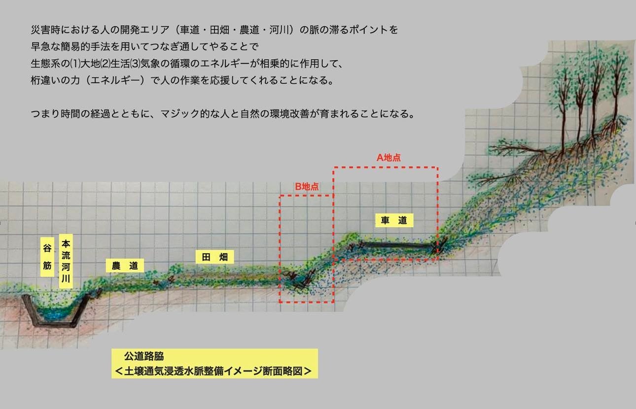 「大地の再生」の手法では、大地の空気と水の通り道を『脈』と呼んで最重要視してきました。山から海へ続く川と、地下水の水脈が、まるで人体の血管のように大地に張り巡らされてすべてのいのちを養ってきました。この『脈』が道路やコンクリート構造物で遮断されることで地下水が滞留し、土砂崩れや地盤を不安定にしているとしたら…。逆に、『脈』を通すことで、大地の循環機能を再生できるとすれば、減災と防災に大いに役立つことができると考えます。この能登被災地において1月から1年近い環境改善活動を通して、斜面崩壊が続いていた場所が安定した土地に変化しています。
