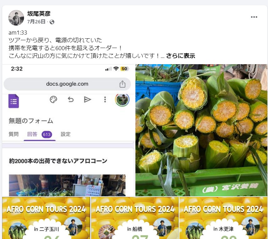 農業の現状、「産地ロス」の問題を知ってほしいという理由から、SNS等を通じて7月25日に規格外のアフロコーンを受け取れる人を募集したところ、1日で600件程の申し込みがあった。