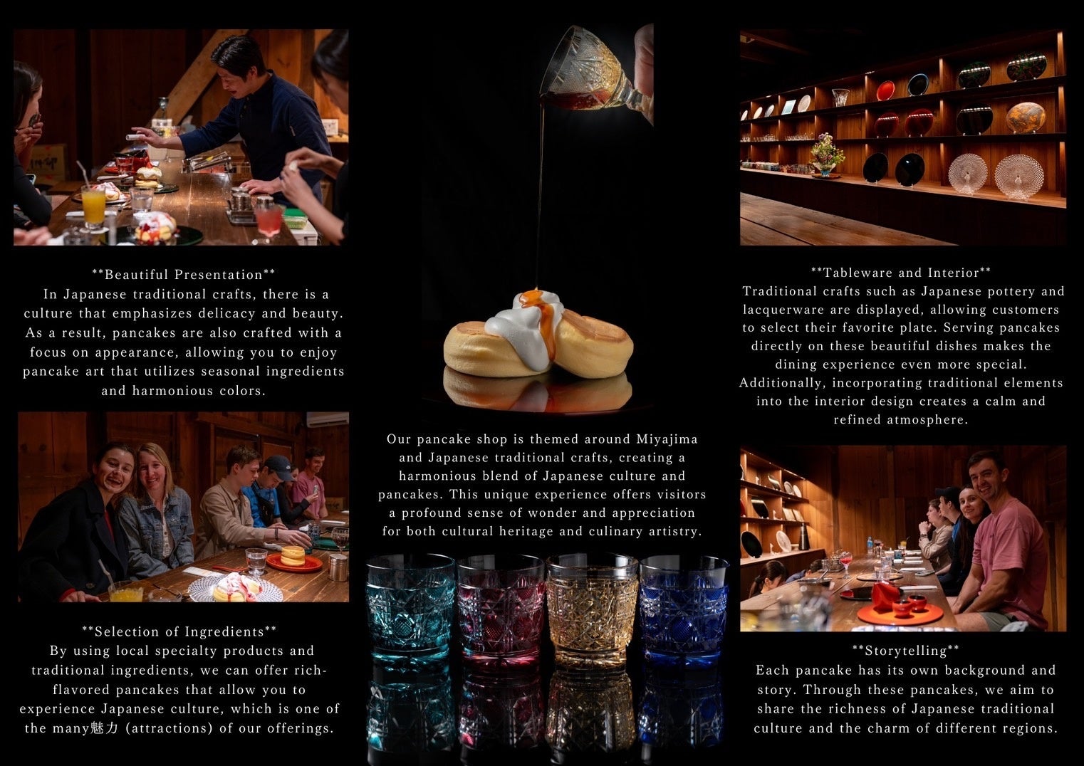 日本の伝統工芸とパンケーキの融合。宮島と日本の伝統工芸をテーマにしたパンケーキ蔵。日本文化とパンケーキの絶妙な融合を実現しています。このユニークな体験を通し、訪れる人々は文化遺産と食の芸術性への深い驚きを感じる事が出来ます。