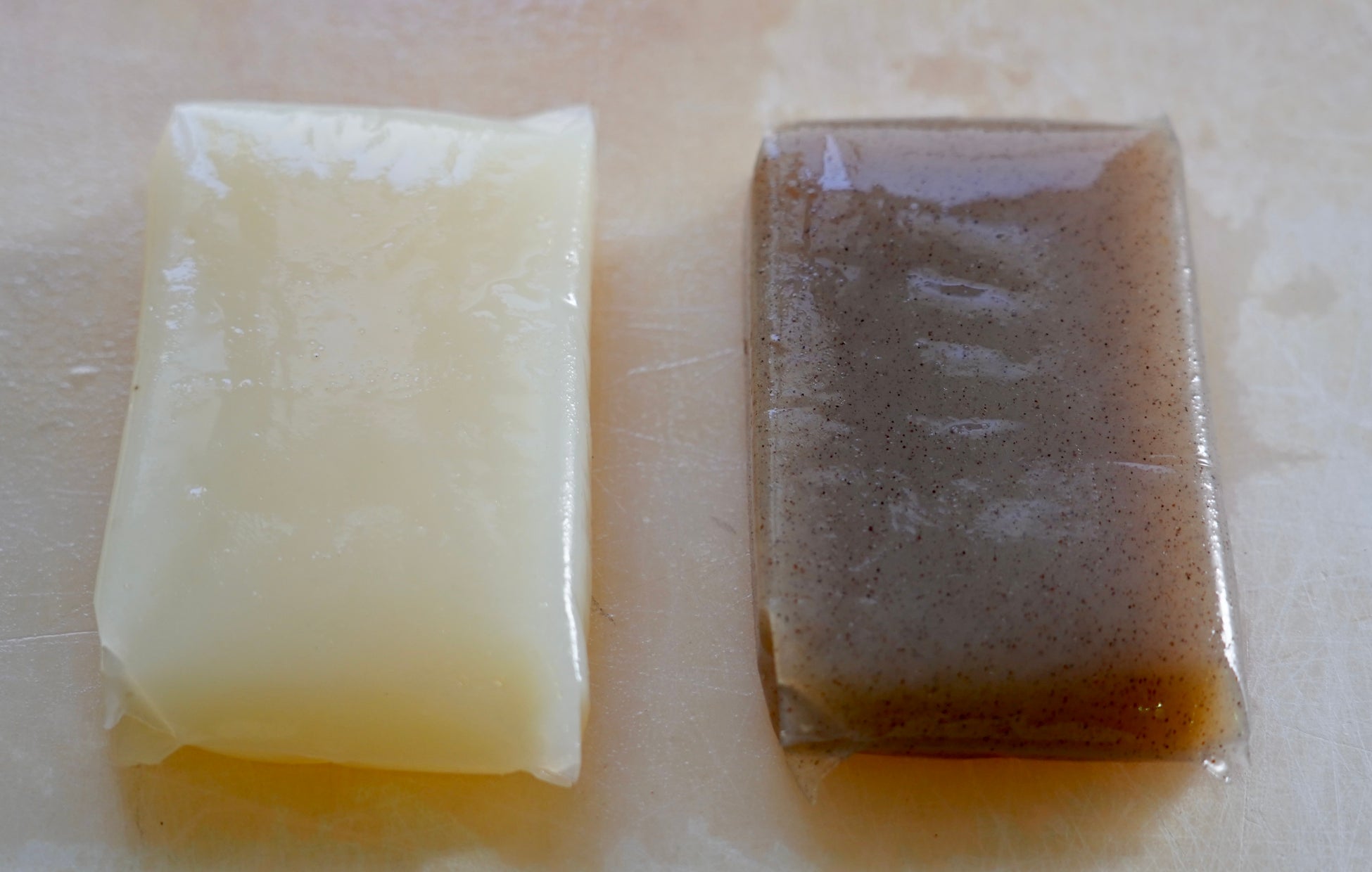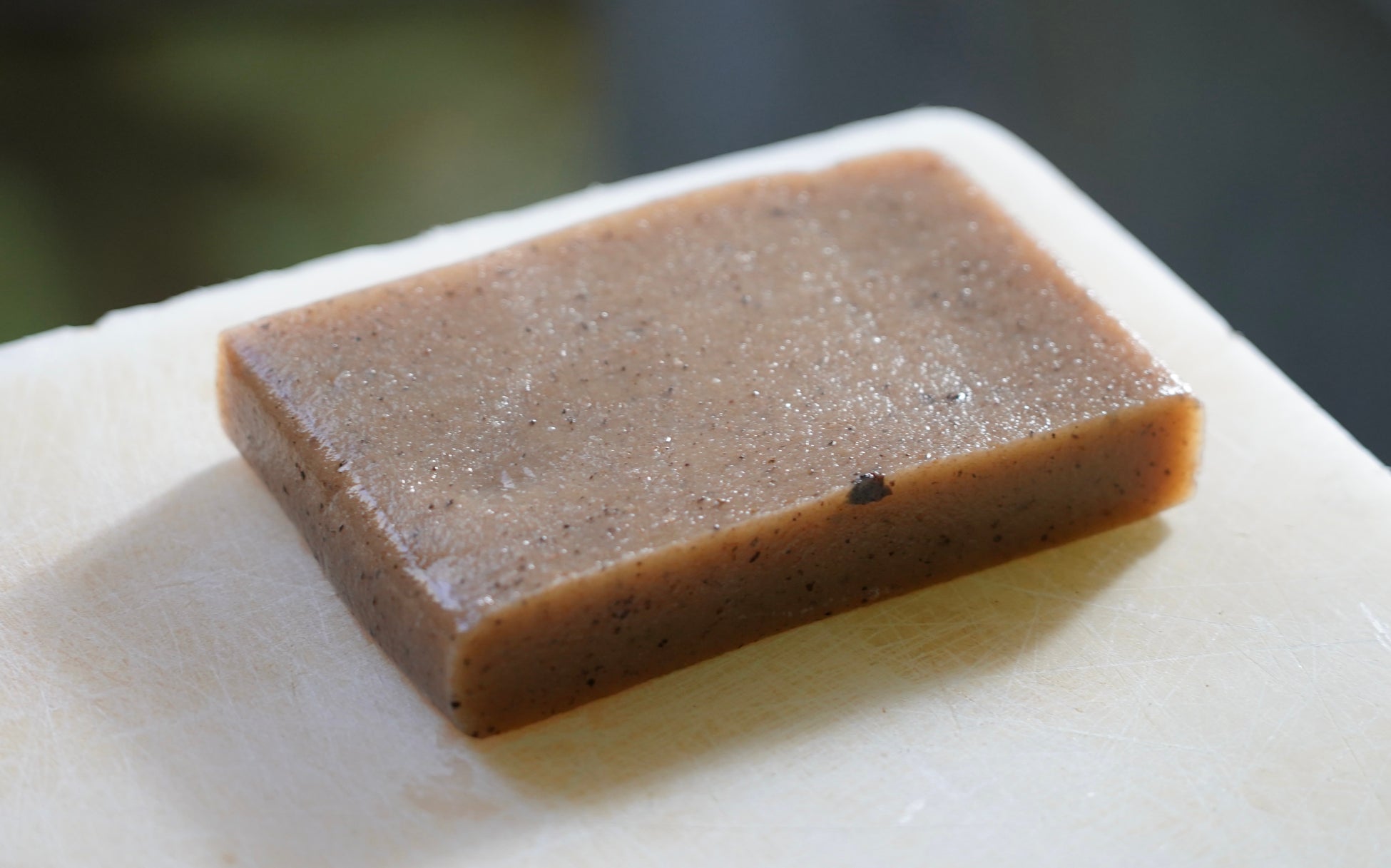それをホンモノのこんにゃくに似せるために、アラメやヒジキなどの海藻の粉末で色をつけます。これが皆さんが普段目にするこんにゃくです。(写真右)