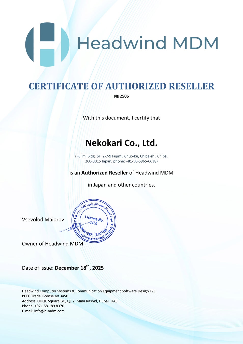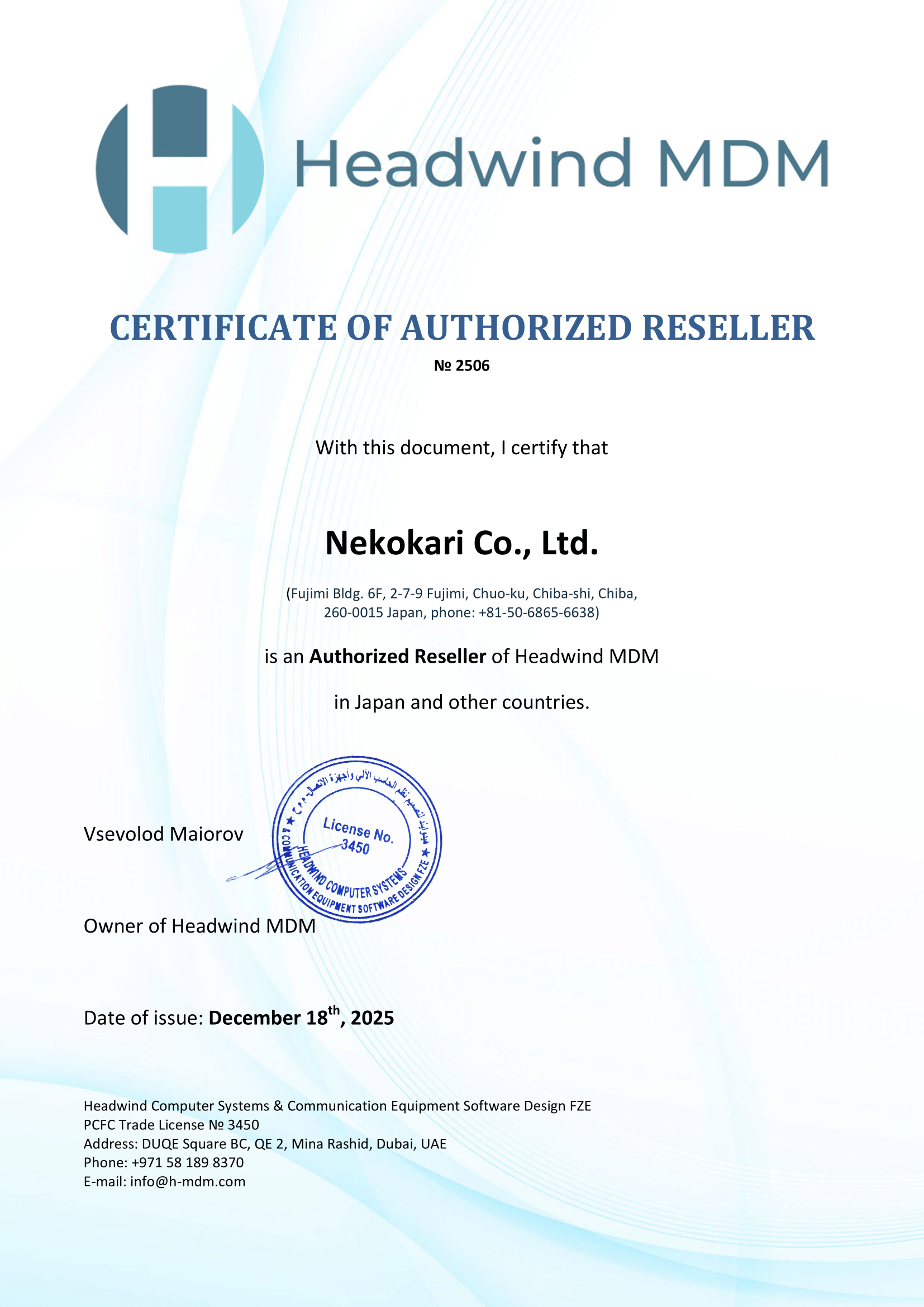 システム開発およびITコンサルティング事業を展開する株式会社ネコカリ(本社:千葉県千葉市、代表取締役:日高 郁彦、以下ネコカリ)は、Headwind Computer Systems & Communication Equipment Software Design FZE(本社:ドバイ、以下Headwind社)と正規販売代理店契約を締結いたしました。