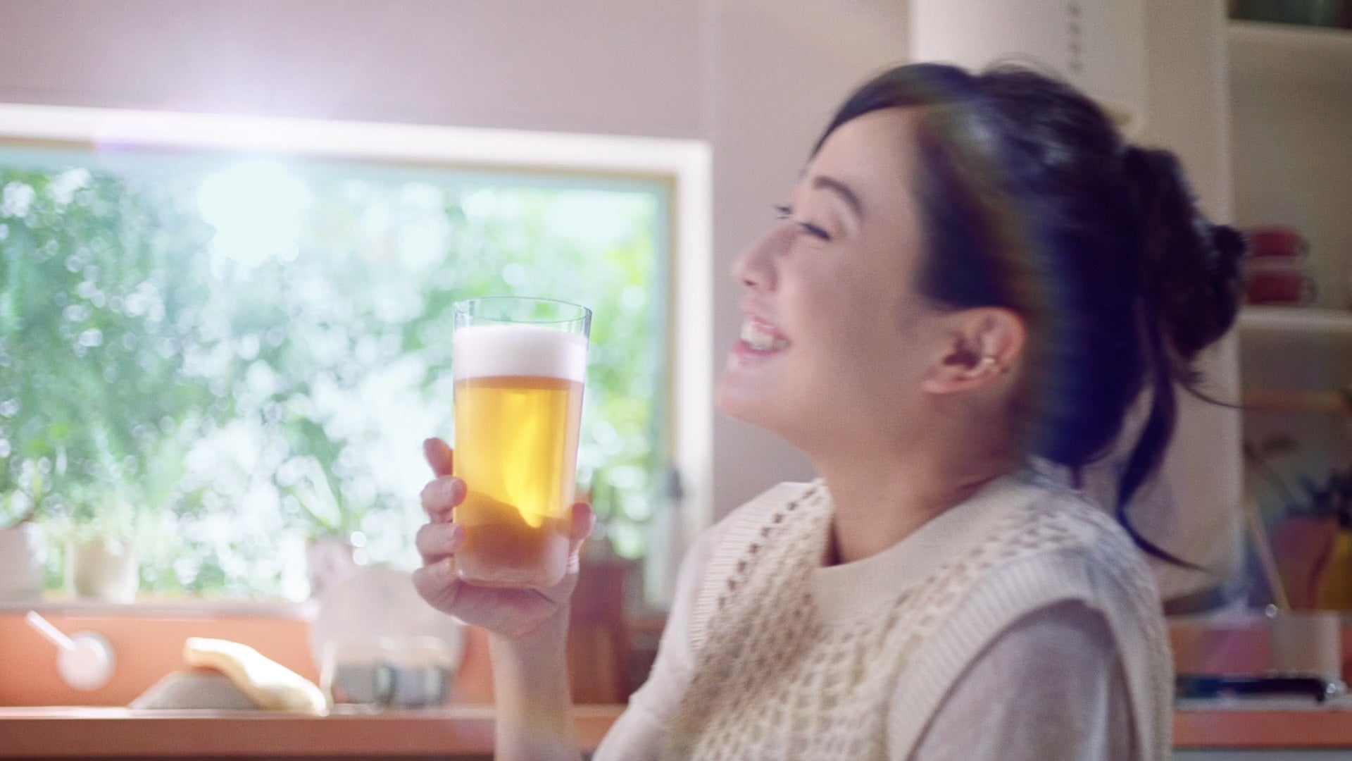 ちょっと頑張った後のお気に入りのランチ。冷蔵庫から「これこれ」と「グリーンズフリー」を取り出し、食卓に並べる菅野さん。「えっ、ノンアル?」という夫からの問いに、「ちょっと頑張ったときにはこれがいいんだよ」と言いつつグラスに注ぎます。ノンアルだからと「思い込みに縛られてると人生損するぞー」と言いながら、おいしそうに「グリーンズフリー」を飲む菅野さんの様子に、今まで抱いていたノンアルへの思い込みを覆される夫。二人仲良く「グリーンズフリー」を楽しむ姿を通じて、これからのノンアルが生み出すおいしく楽しい時間が描かれています。