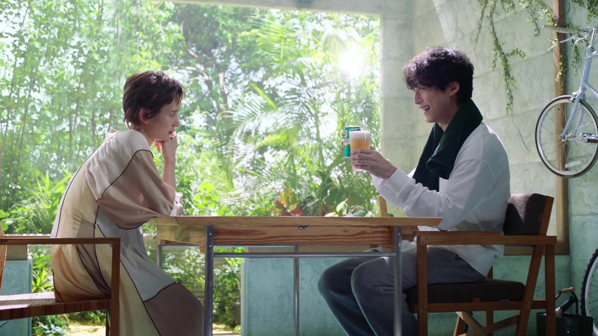 人に、今の時代のノンアルとして新しくなった「グリーンズフリー」を紹介します。「今日がうれしくなる、これからのノンアル。」というメッセージにふさわしい新「グリーンズフリー」を、うれしそうにそれぞれのスタイルで楽しむ、お二人の満足げな表情にもぜひ注目ください。