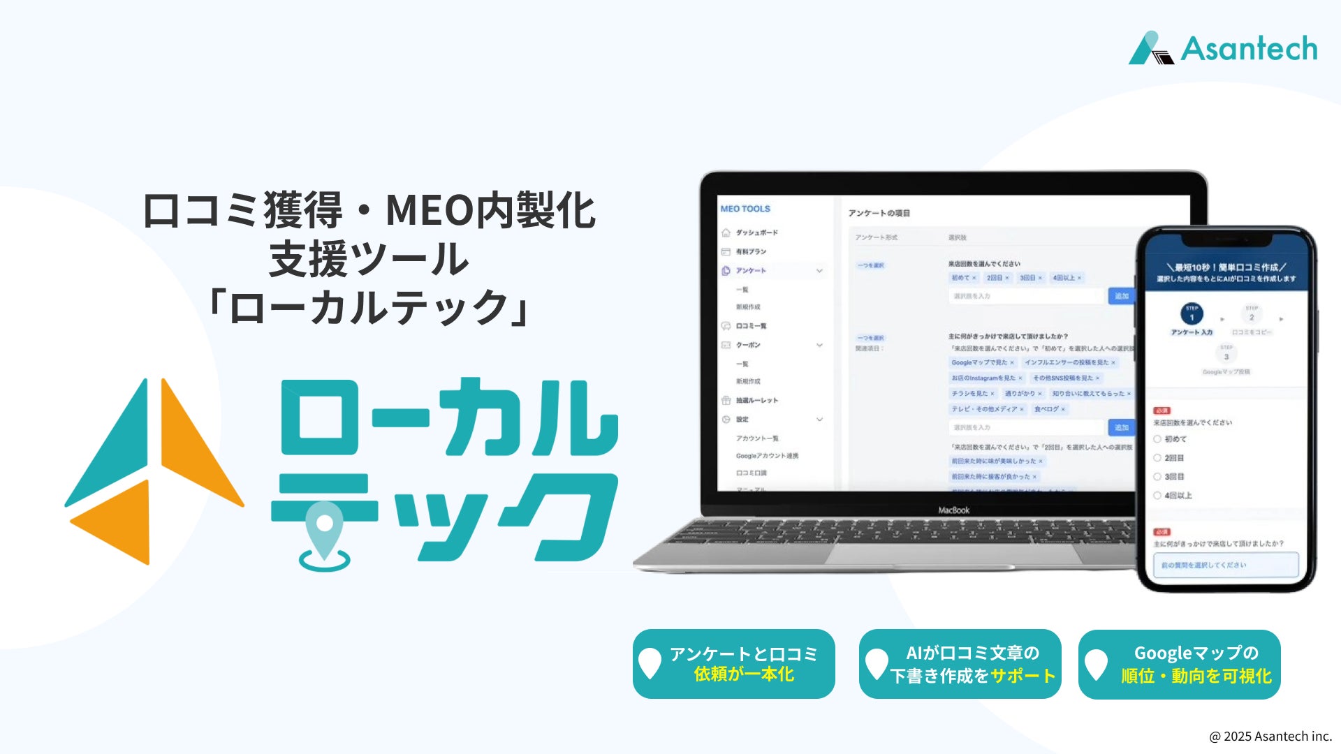 中小企業の集客支援を手がけるAsantech株式会社(本社:東京都台東区、代表取締役:高野光博)は、Googleビジネスプロフィールの集客力を最大限に引き出すMEOツール「ローカルテック」を2025年6月より正式にリリースしました。