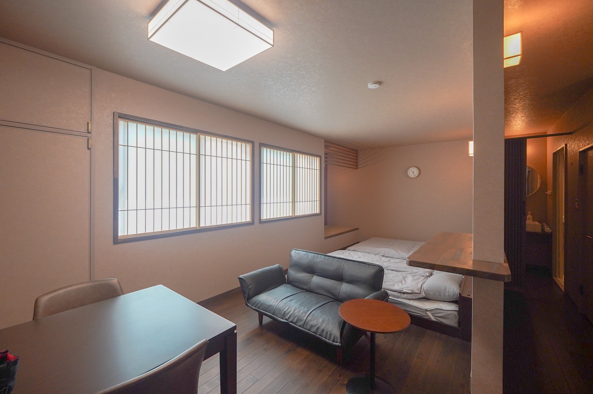 本物件は、えんやに隣接する敷地に立つアパートで、長年空き家になっていました。えんやでは飲食業で近年増加しているインバウンド需要に対応してきましたが、夜遅くまで飲食を楽しんだ後、宿泊してさらに日光を楽しみたいという需要を感じ、旅館業を取得して宿泊施設をオープンするに至りました。地元のデザイナーと協業でフルリノベーションした宿泊施設では、3室に最大14名がゆったりと過ごす宿泊体験を提供しつつ、素泊まりを基本とし、近隣事業者と連携したクーポンを発行することにより、食事は地元の飲食店や商業施設の利用を促進し、地域経済の活性化に寄与することを目指しています。内装はインバウンドを意識した和モダンテイストで、畳やこたつなど、日本文化を体験できる要素を取り入れつつ、浴槽の代わりにシャワールームを採用し、外国人旅行者でも疲れにくい、海外のライフスタイルに合わせたデザインを取り入れています。栃木県の県産材である大谷石も活用し、地元の魅力を海外に向けて発信する場にもなると考えています。