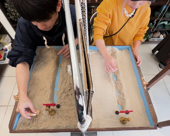 砂箱の真ん中に仕切りをし(或いは、二つの砂箱を使って)、一人が創作しながら、その創作内容を言葉で表現します。その内容を聞いて、もう一人は創作内容を「まね」します。どこまでマネできるか?砂の形状からミニチュアの位置まで、難しさを味わいながら、コミュニケーションが深まります。