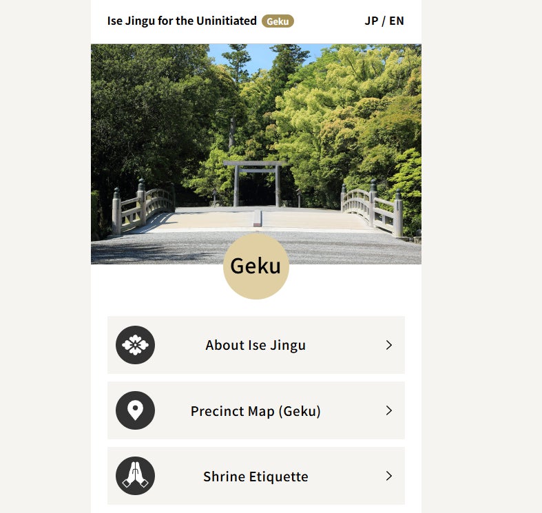 「はじめての伊勢神宮」は、伊勢神宮の基本情報や魅力だけでなく、外宮と内宮の域内マップやモデルコース、参拝の作法などを参照できるページとなっています。見やすさと操作性を重視したシンプルなデザインとしており、英語と日本語のページを用意しました。現在、伊勢神宮の周辺店舗と宿泊施設において本LPに誘導するカードを順次配布しており、配布エリアは今後、伊勢志摩全域へ拡大する予定です。