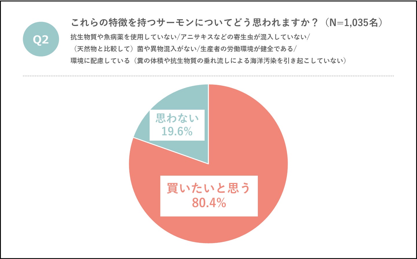 そして、閉鎖循環式陸上養殖サーモンの特徴である、「抗生物質や魚病薬の不使用」、「アニサキスなどの寄生虫が混入していない」、「(天然物と比較して)菌や異物混入がない」、「環境に配慮している(糞の体積や抗生物質の垂れ流しによる海洋汚染を引き起こしていない)」、「生産者の労働環境が健全である」といったクリーンな要素を兼ね備えたサーモンに対する購入意向を聞いたところ、80.4%が「買いたい」と回答しました。